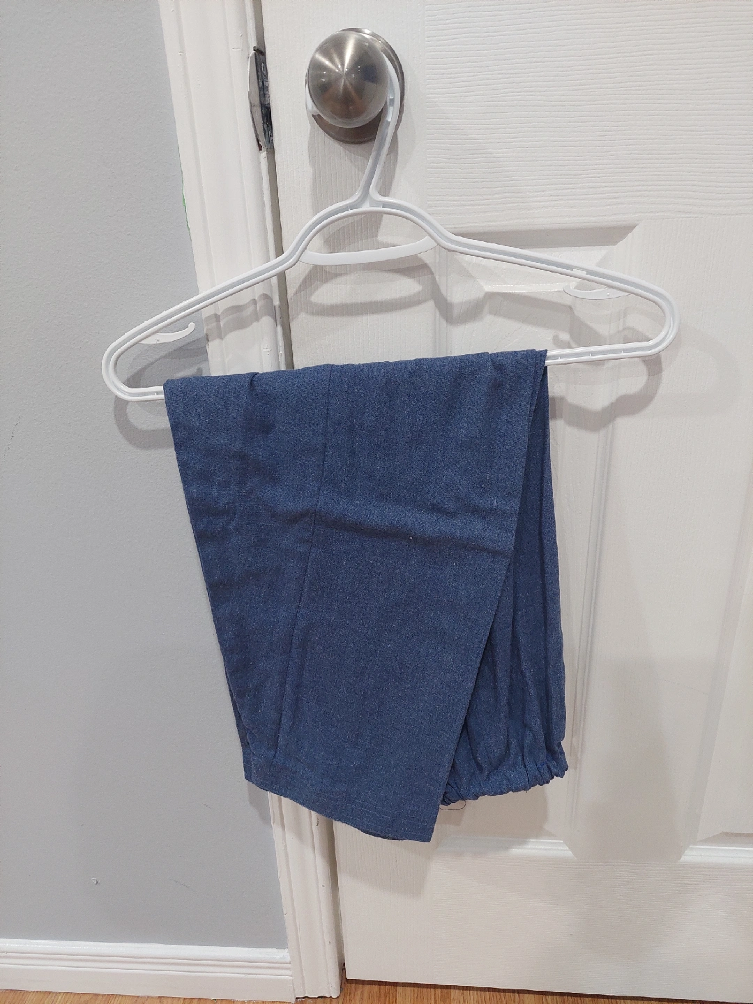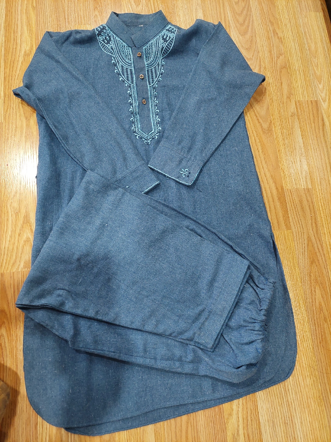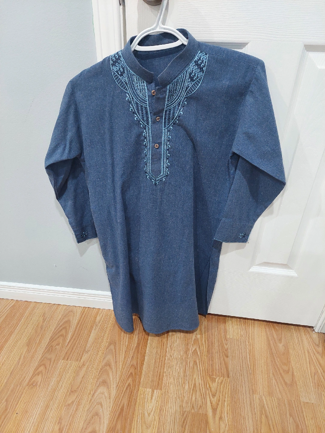 A lovely blue kurta pajama set with detailed embroidery around the neckline and button area. The material appears to be a comfortable denim-like fabric. Perfect for casual or semi-formal occasions! Kurta Length: 32in Width: 18in Sleeves: 18in Bottom: 32.5in