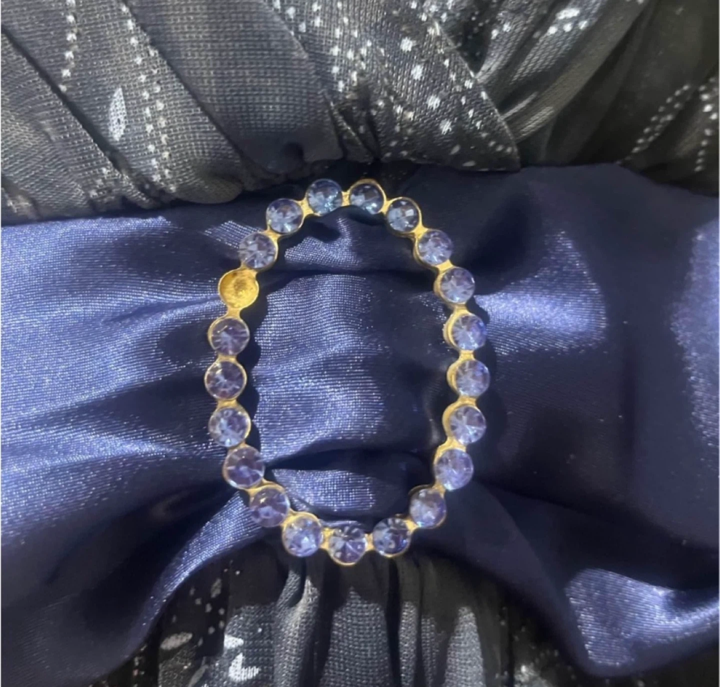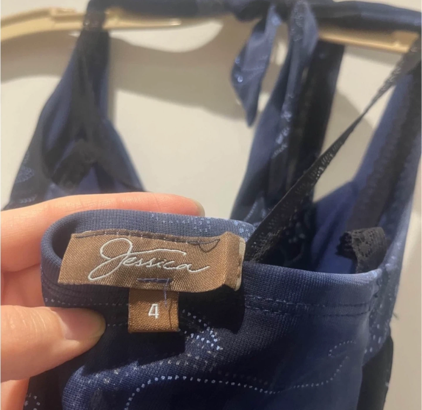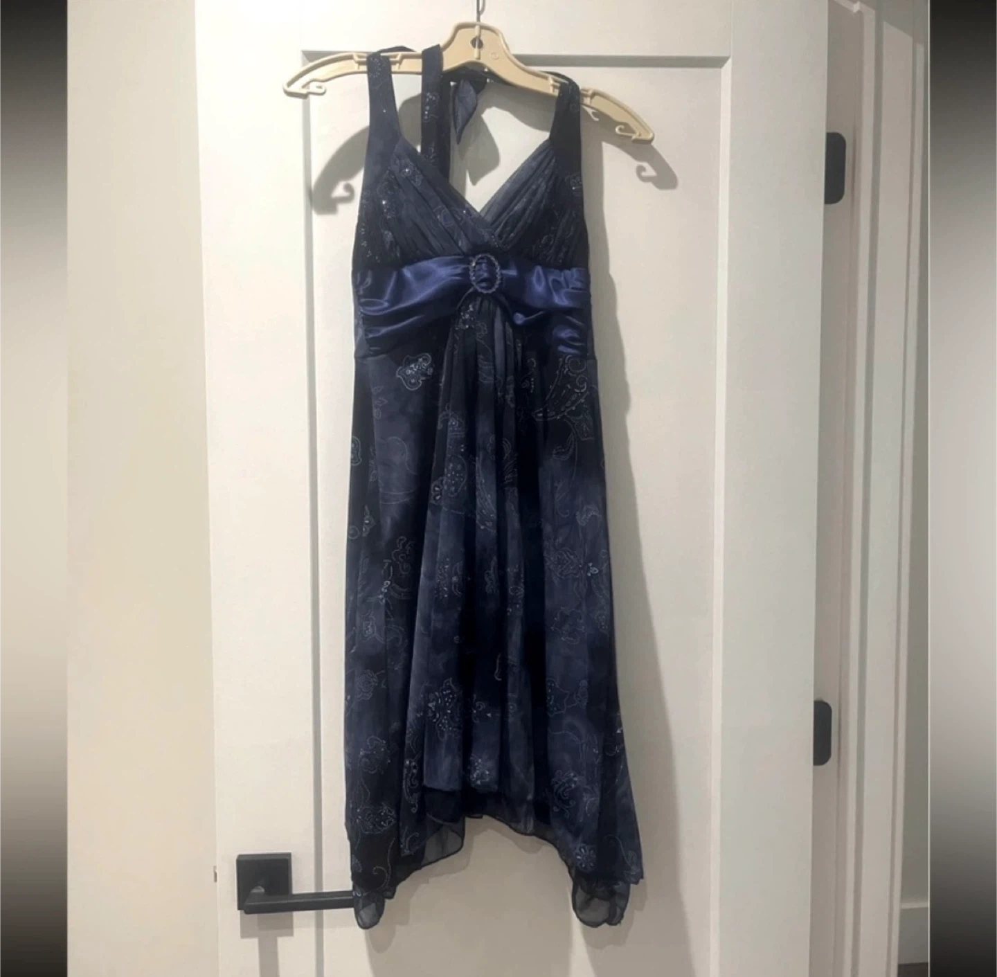 Blue Halter Dress, Size 4 Knee Length Great condition, only worn a few times One gem is missing from the front, but could replace it or colour over the gold and wouldn’t be very noticeable. Smoke Free Home 🚭