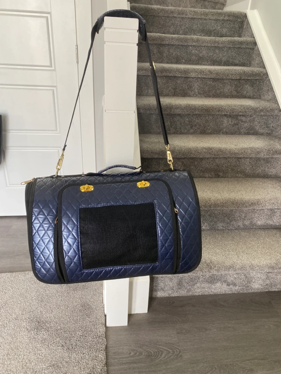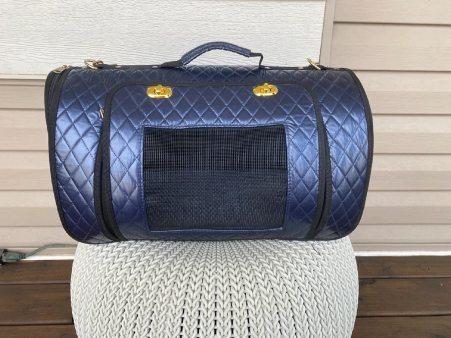 This quilted pet carrier is in great condition! It's a stylish and functional way to bring your furry friend along with you. The carrier features a zippered opening, mesh windows for ventilation, and a comfortable carrying handle. The blue quilted design gives it a chic look!