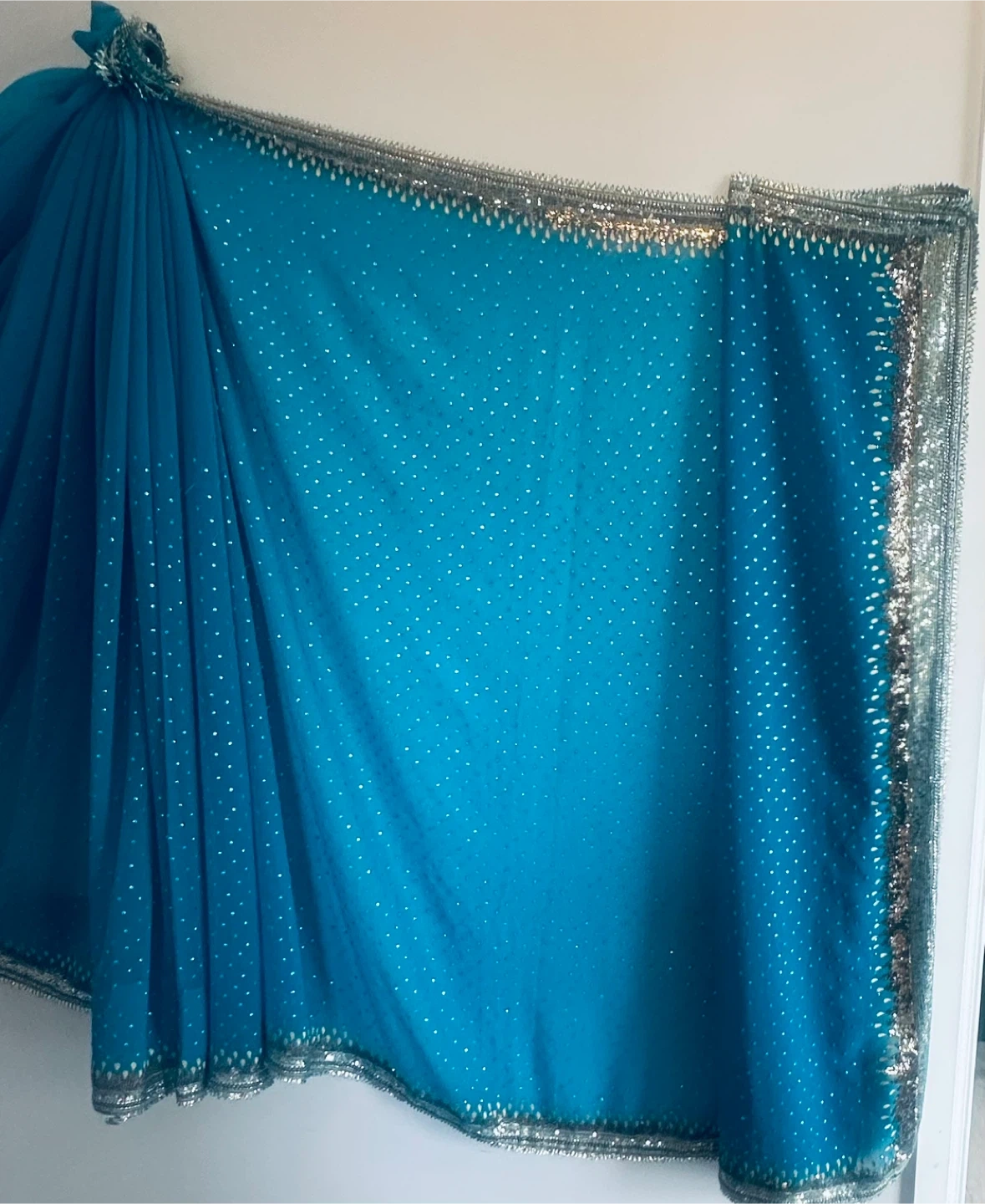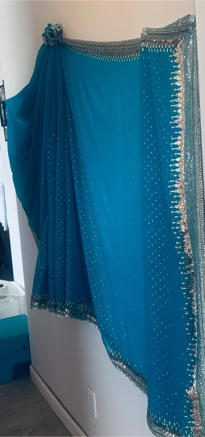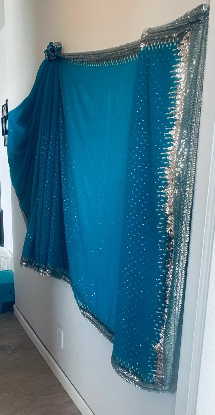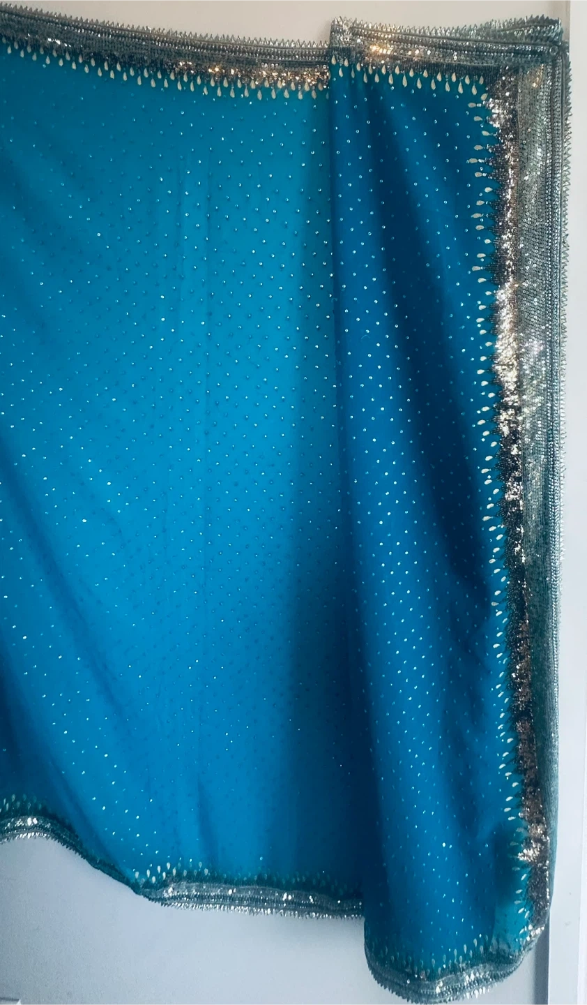 Beautiful blue sari featuring delicate silver embellishments Perfect for special occasions or adding a touch of elegance to any outfit