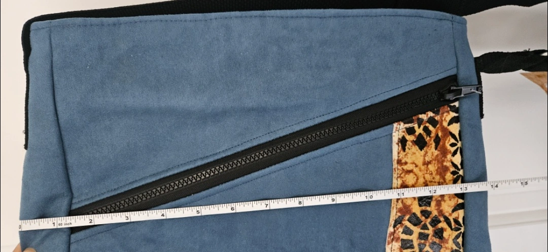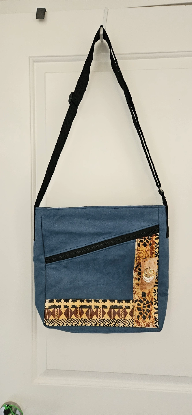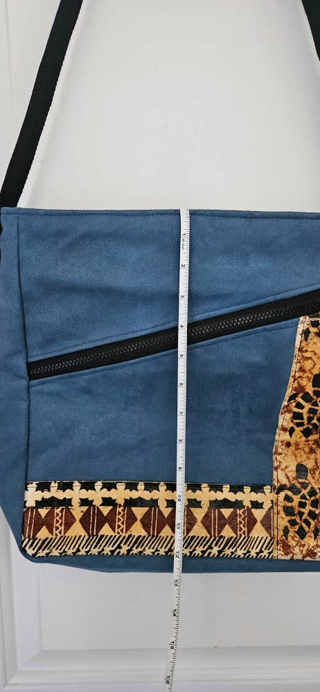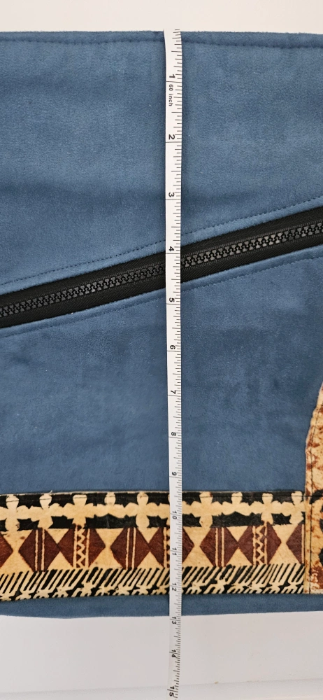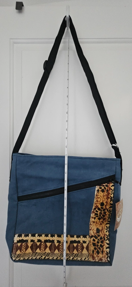 Measures 12 inches high by 13 inches wide (by 2.5 inches deep). Here's a stylish blue shoulder bag with a long and adjustable black strap! Made in, and, bought from Fiji. Can be worn as both a crossbody and shoulder bag. It features a unique design with a zipper and patterned accents. Perfect for everyday use.