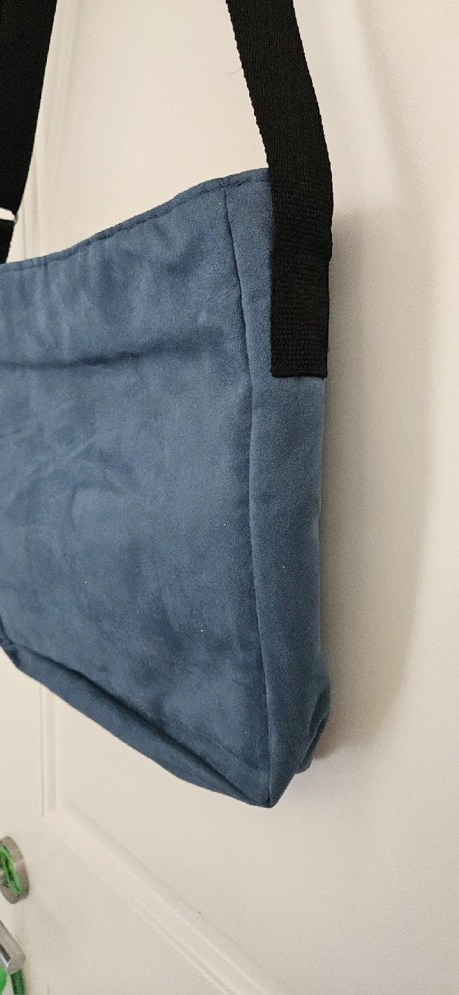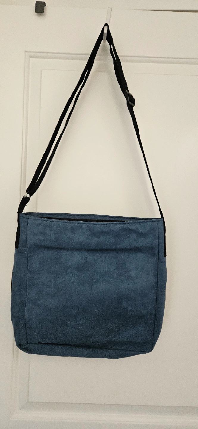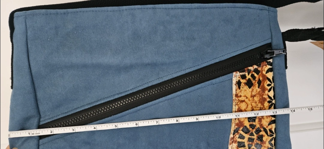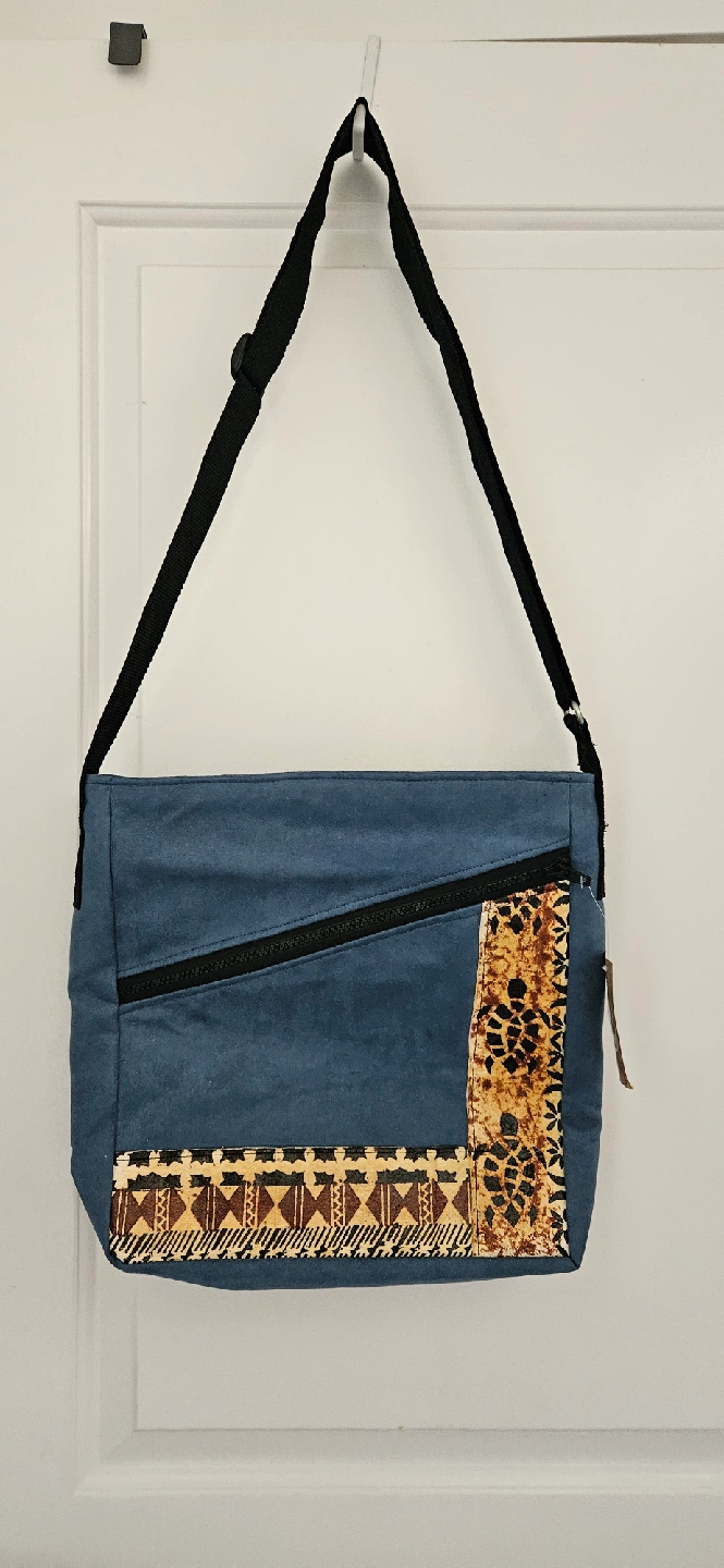 Measures 12 inches high by 13 inches wide (by 2.5 inches deep). Here's a stylish blue shoulder bag with a long and adjustable black strap! Made in, and, bought from Fiji. Can be worn as both a crossbody and shoulder bag. It features a unique design with a zipper and patterned accents. Perfect for everyday use.