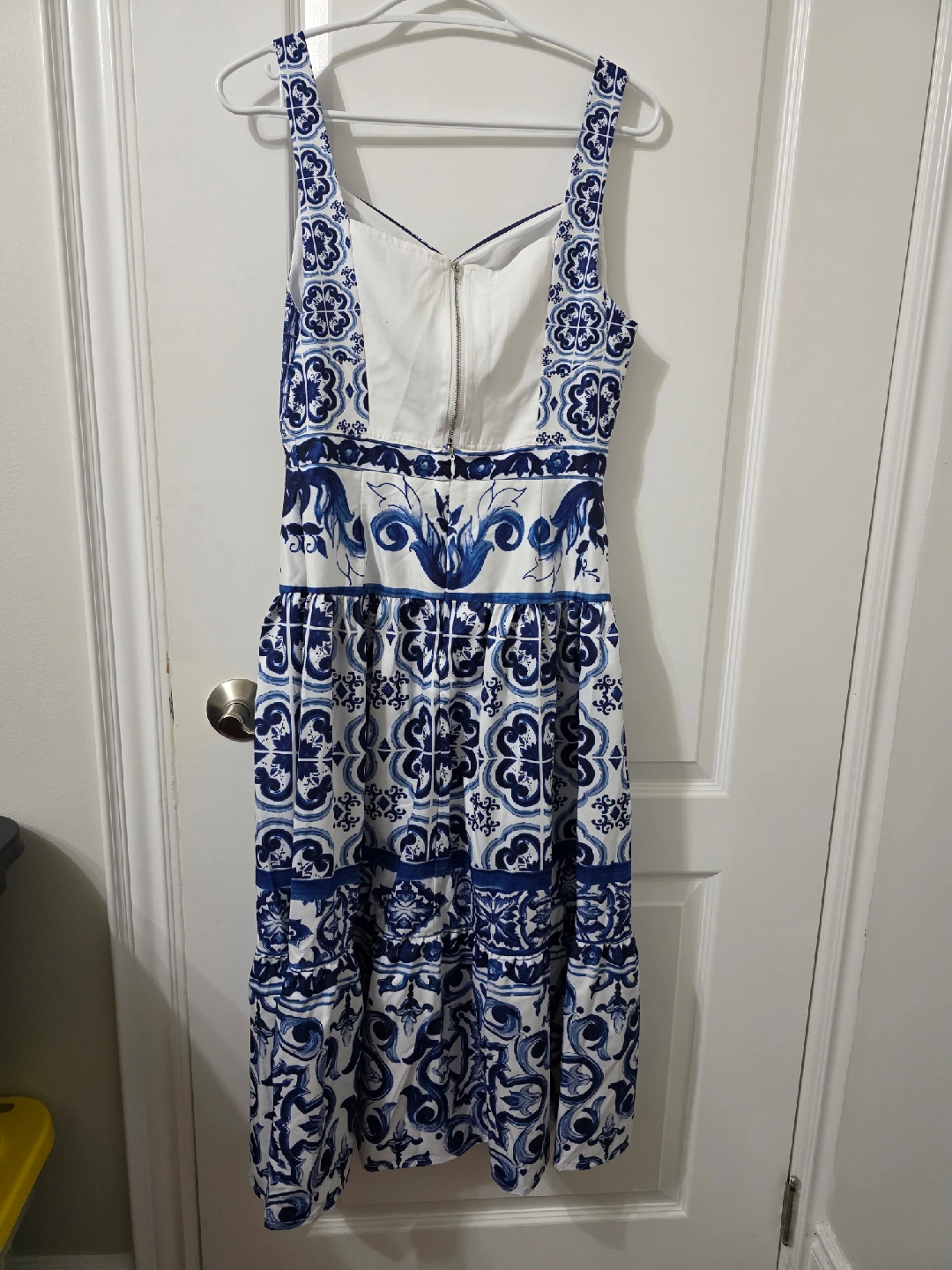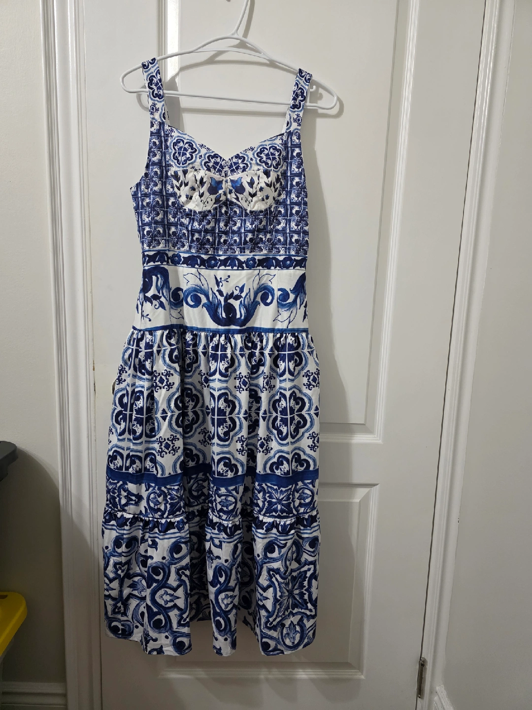 This is a really cute sundress with a blue and white pattern. It's perfect for summer days and is in new condition! It features a tiered design and a comfortable fit. Feel free to message me if you have any questions!