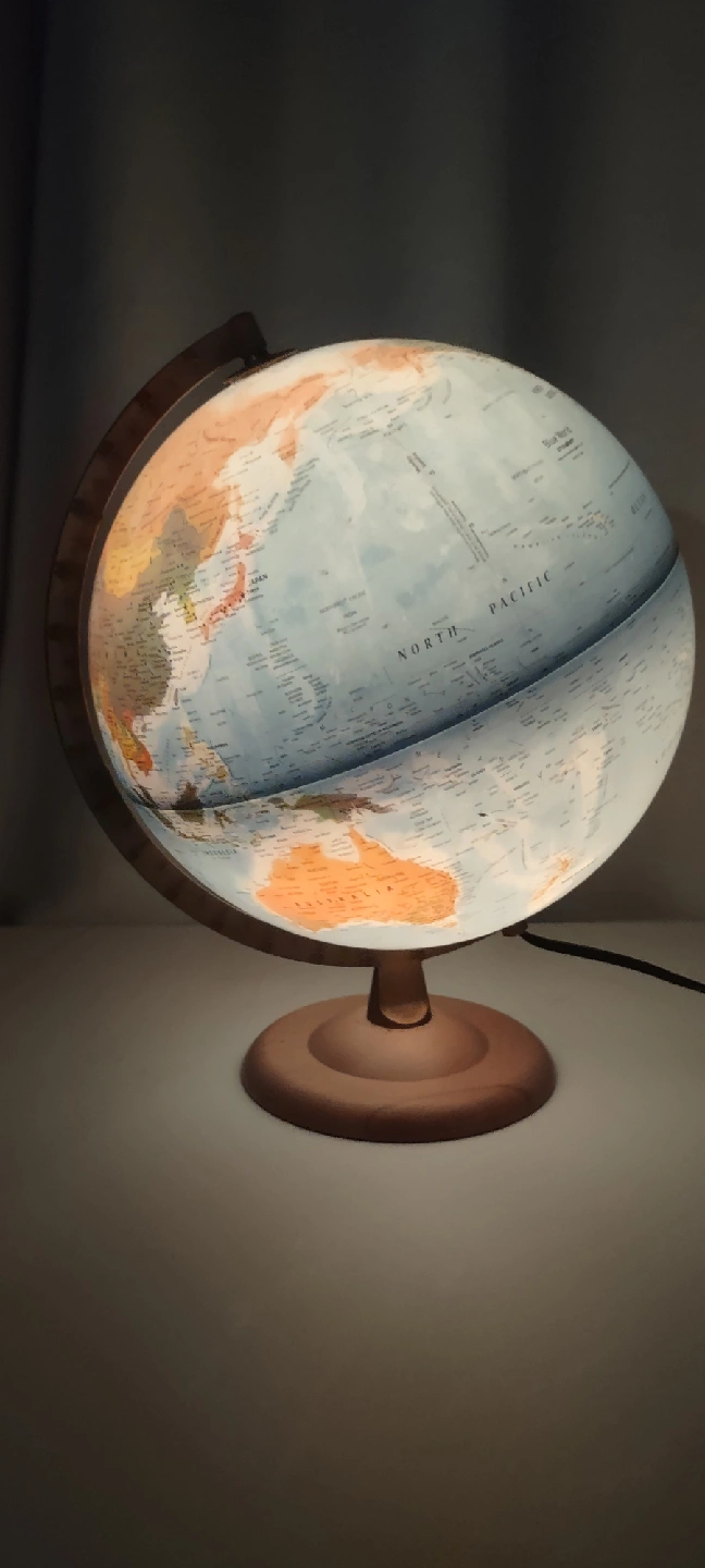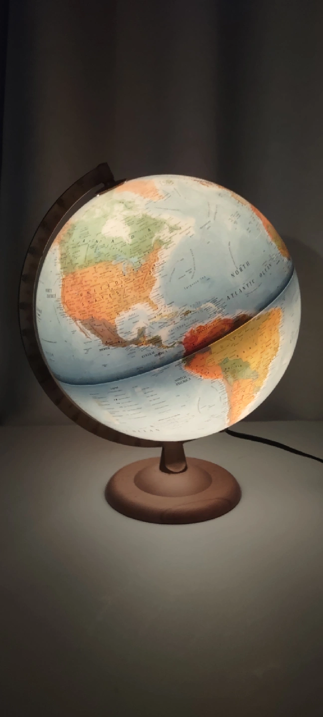 Selling a 'Blue World Atmosphere' globe lamp! It's in great shape and would look lovely in any room. The globe features detailed cartography and illuminates when plugged in, creating a warm and inviting atmosphere. It has a wooden base and a sturdy frame. Perfect for adding a touch of vintage charm to your home! Retail l Price $170-$200