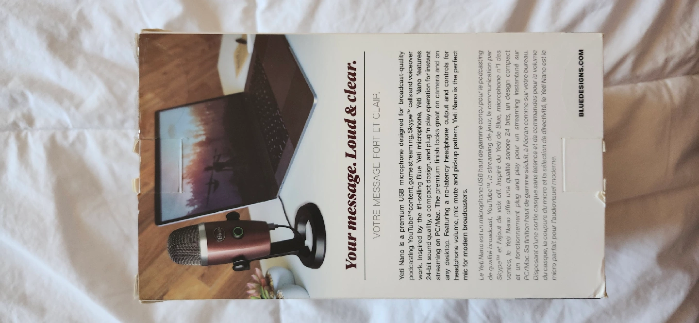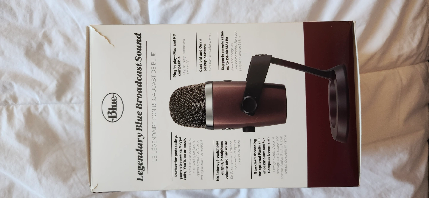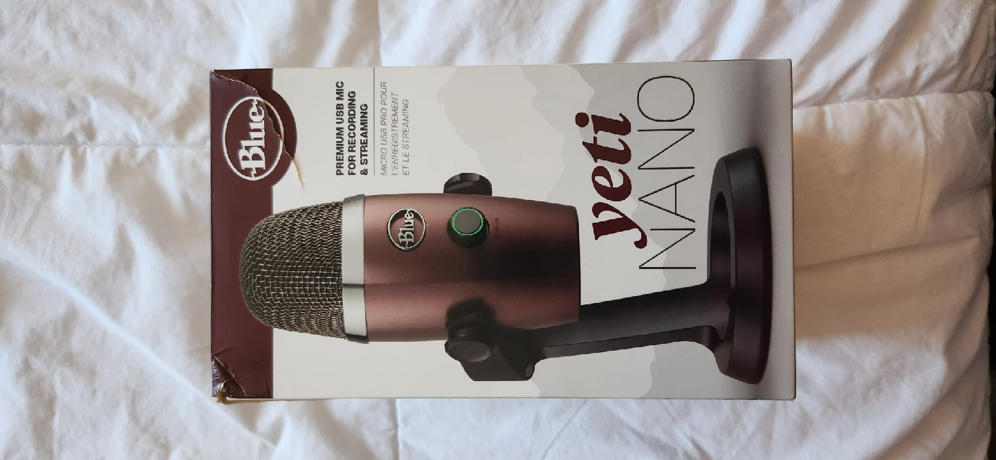 Selling a Blue Yeti Nano premium USB microphone for podcasting, YouTube, gaming, and streaming! It's compatible with Mac and PC and supports sample rates up to 24-bit/48kHz. It also features no-latency headphone monitoring, volume and mic mute. The box is included