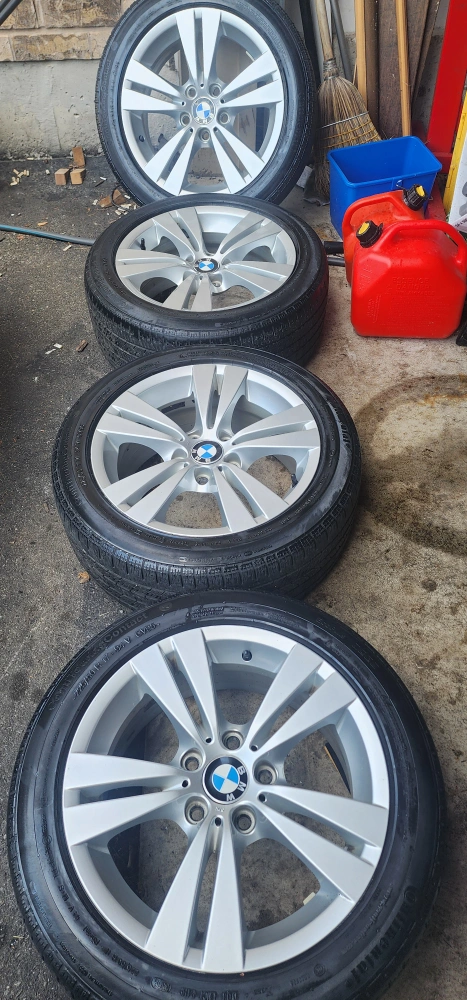 Selling a set of four BMW wheels with Continental tires. The tire size is 225/50R17. The wheels are silver and marked 'Made in Italy'. They are in fantastic condition and ready for a new vehicle. would be great fir mounting winter tires First $200 takes em away! thanks, Sean