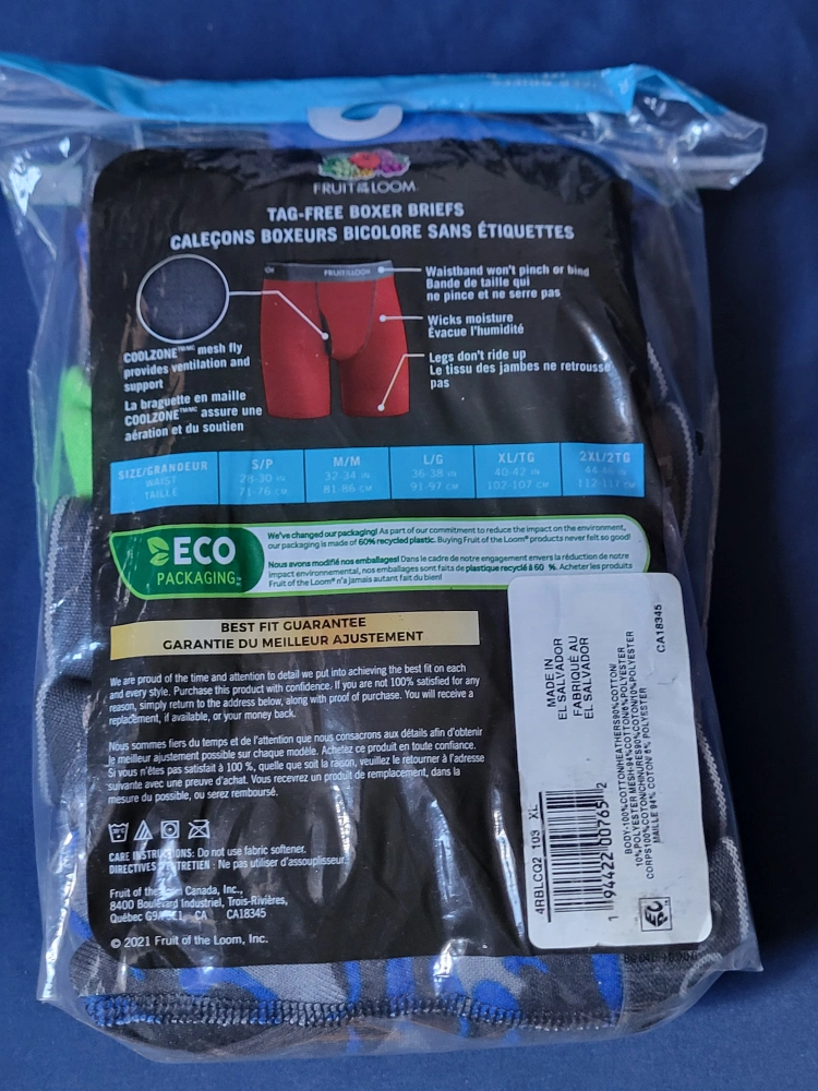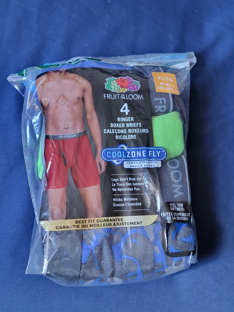 Brand New pack of Fruit of the Loom boxer briefs, size XL (40-42 or 102-107 cm). These ringer boxer briefs Are tag Free have a Coolzone fly for ventilation and wicks moisture. They also have legs dont ride up a best fit guarantee! Please Contact Thanks
