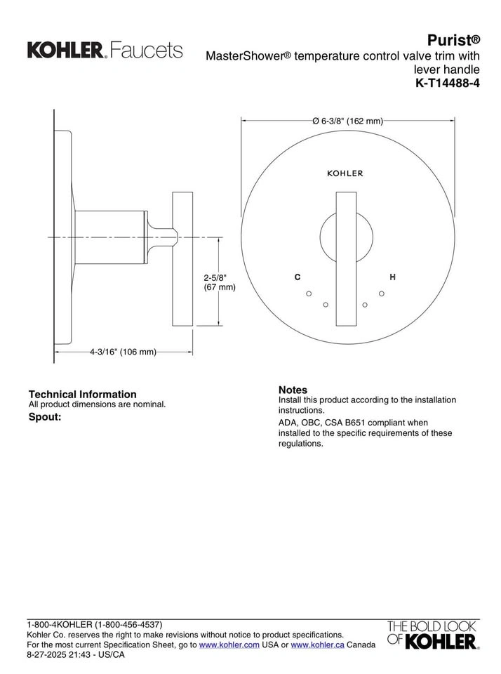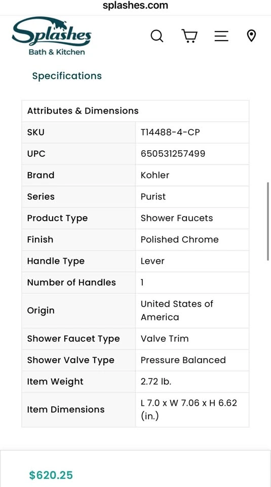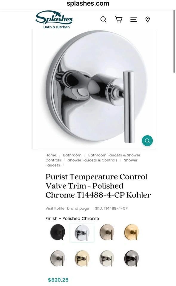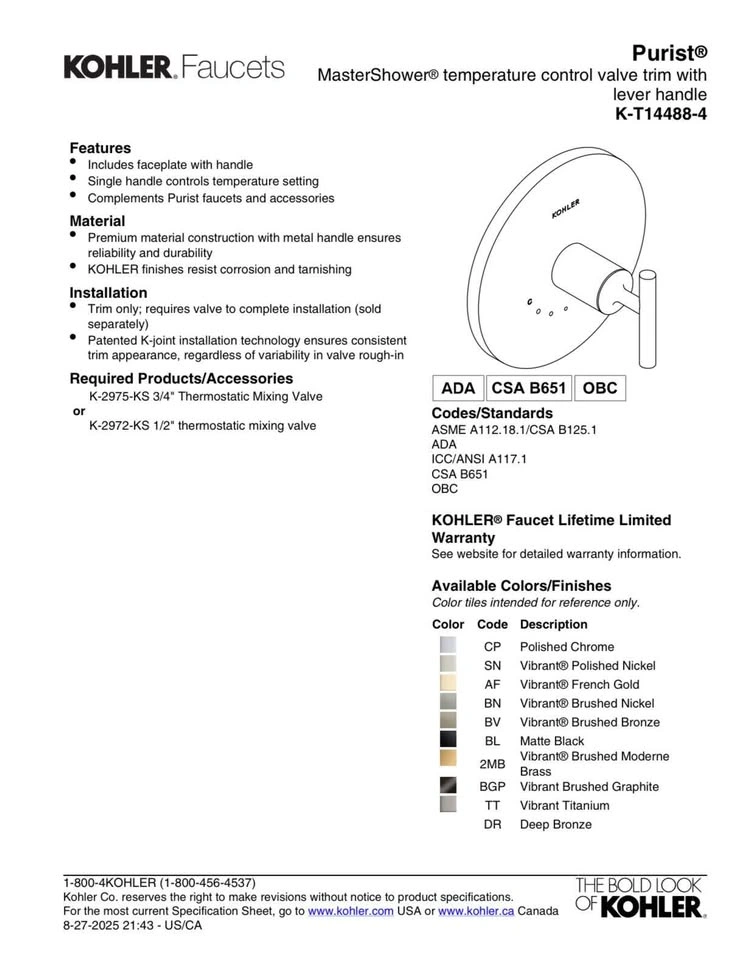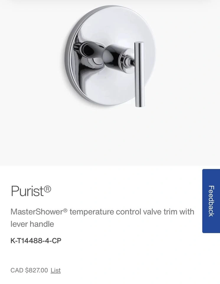 Purist Temperature Control Valve Trim - Polished Chrome T14488-4-CP Kohler Brand New in box and pickup it at 8880 Williams Road Richmond. (Required Rough-In not included : K-2975-KS 3/4" Thermostatic Mixing Valve or K-2972-KS 1/2" thermostatic mixing valve) Cash Only