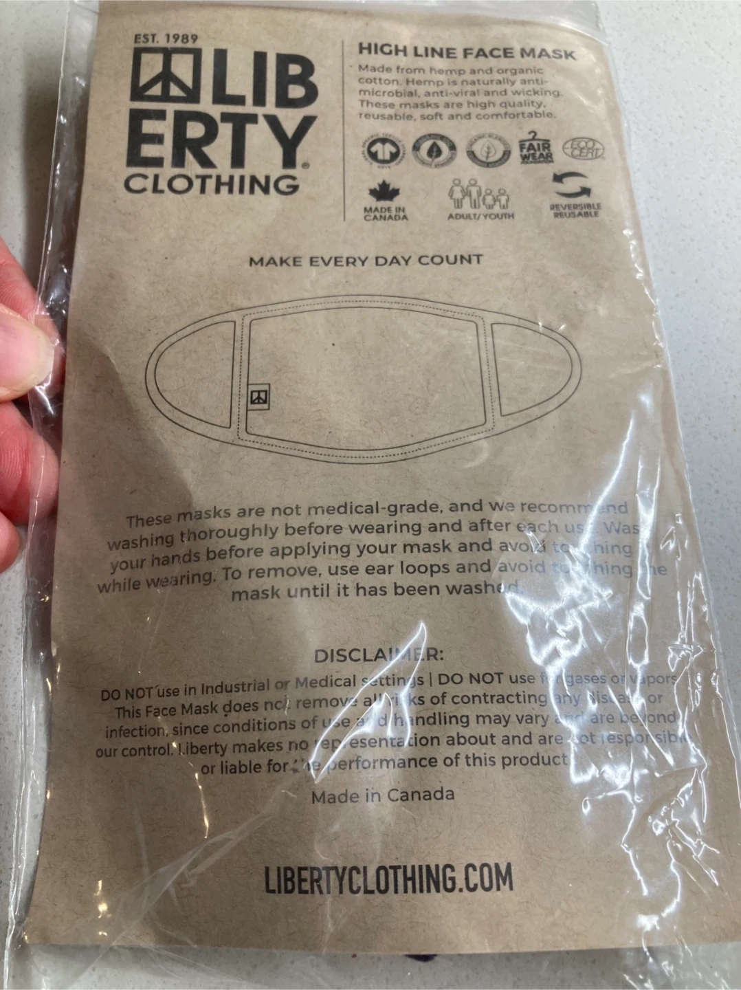 Selling new in package 1 Liberty Clothing face mask bought at Whole Foods a few years ago. These masks are made from hemp and organic cotton, making them antimicrobial, anti-viral, and wicking. They are high-density, reversible, soft, and comfortable with adjustable ear loops. The colour is navy/redux and the size is O/S.