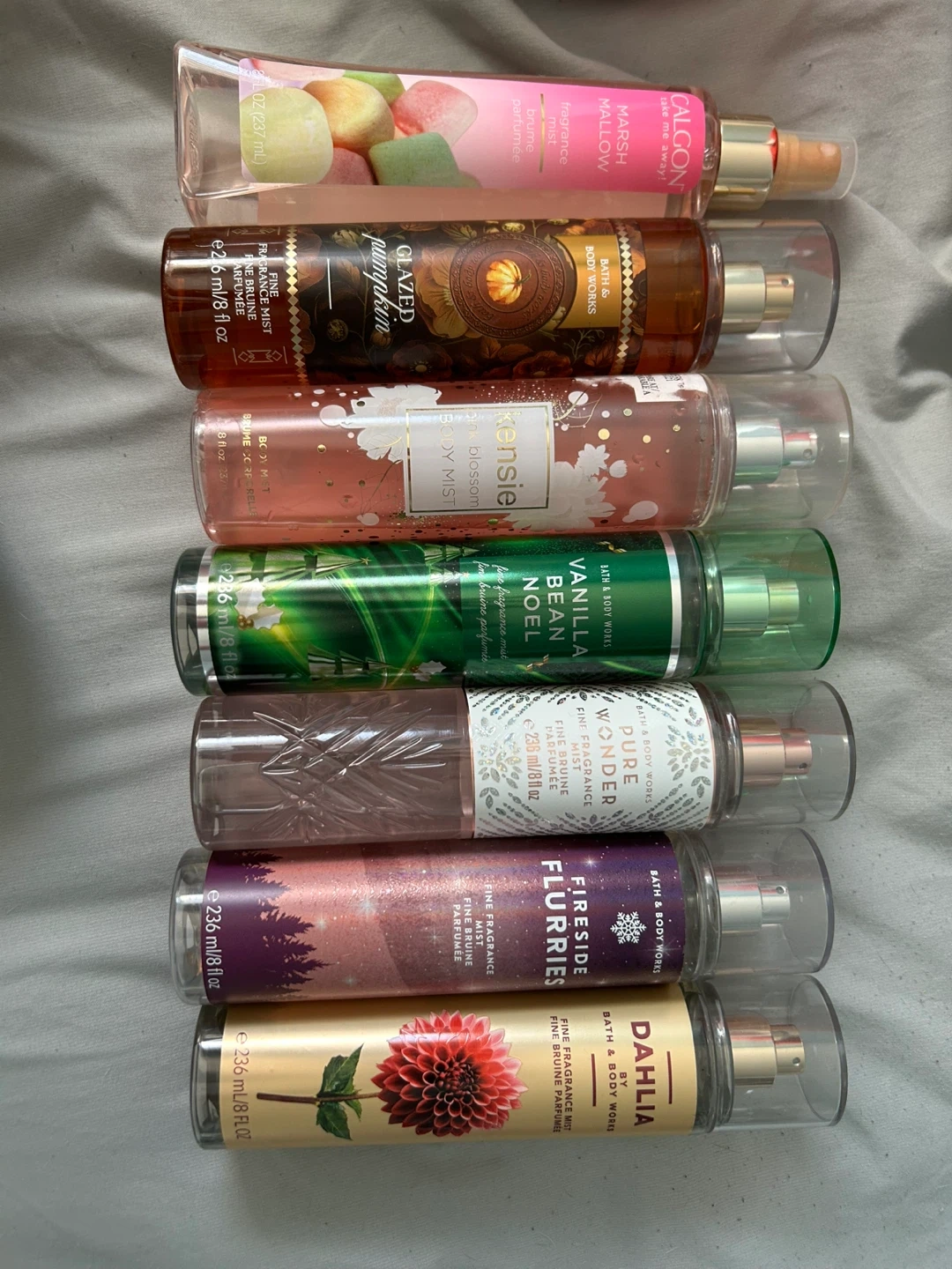 Selling a bundle of fragrance mists! Includes: - Calgon Marshmallow - Bath & Body Works Glazed Pumpkin - Kensie Skin Blossom Body Mist - Bath & Body Works Vanilla Bean Noel - Bath & Body Works Pure Wonder - Bath & Body Works Fireside Flurries - Bath & Body Works Dahlia Each bottle contains 236ml/8 fl oz - prices will vary depending on scent, some are brand new, some are slightly used
