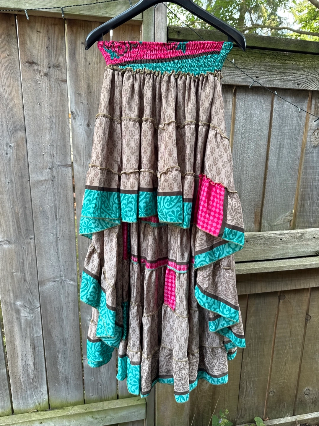 This is a really unique tiered skirt with a boho vibe! It features a mix of patterns and colours, including a smocked elastic waistband. Perfect for adding a pop of fun to your wardrobe!