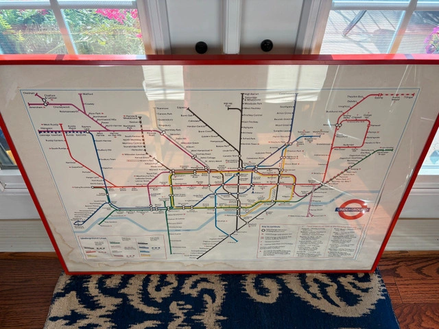 Add a unique conversation starter with this striking framed London Underground map. This Large Vintage Framed London Underground Subway Map features a sleek, glossy red frame. Perfect for travel lovers, collectors, and anyone who wants to bring a bit of London charm home! Product Details: Type: London Underground Subway Map (Framed) Frame Color: Glossy red for a bold, modern look Measurements: 71 cm (H) x 102 cm (W) x 2.5 cm (D) Condition: Great overall! A touch of water damage to the bottom edges of the poster adds to the rich history of this piece; as if rescued from the tunnels of London themselves! Why You’ll Love It: This is more than just a subway map — it’s an iconic conversation piece. Its oversized format and vivid red frame make it perfect for living rooms, home offices, studios, or commercial spaces. A must-have for London enthusiasts or anyone who loves unique wall art! Price: $70 (Retail ~$180) Pickup in Thornhill / Local Delivery Available. Cash and cashless payment accepted.