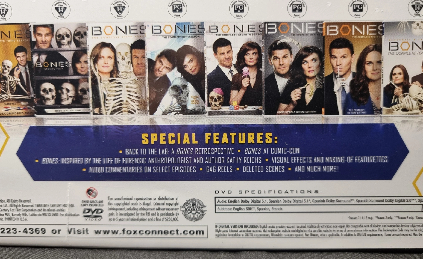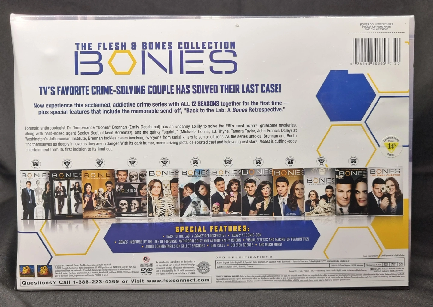 Selling the complete Bones DVD collection! This set includes all 12 seasons together for the first time, with over 6 hours of bonus features. TV's favourite crime-solving couple has solved their last case in this addictive crime series. A must-have for any Bones fan! Mint/pristine condition. Unopened. Original seal. No pet non-smoking household. Check out my other listings. All are mint and unopened except one - which is clearly labelled. I am a verified user. Cash only.