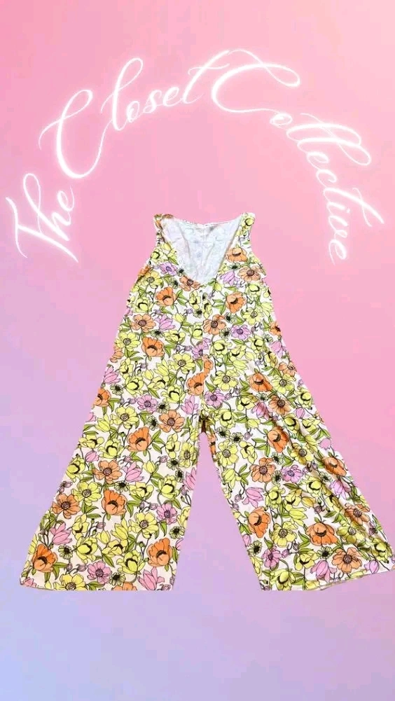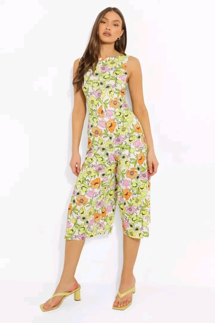 This is a Boohoo floral print culotte jumpsuit. It features a vibrant floral pattern with orange, pink, and yellow flowers on a light background. Perfect for a sunny day out!