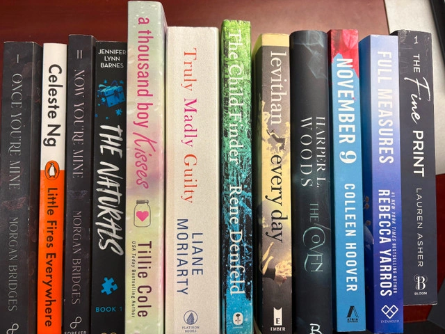 Booktok books for sale! $12/each or 5/$50. Books currently available: The Coven - Harper L Woods, Every day - David Levithan, The Child Finder - Rene Denfeld, Truly Madly Guilty - Liane Moriarty, The Fine Print - Lauren Asher, Full Measures - Rebecca Yarros, November 9 - Colleen Hoover, A Thousand Boy Kisses - Tillie Cole, The Naturals - Jennifer Lynn Barnes, Now You’re Mine - Morgan Bridges, Little Fires Everywhere - Celeste Ng, Once You’re Mine - Morgan Bridges. Condition: Used - Like new. Cash accepted.