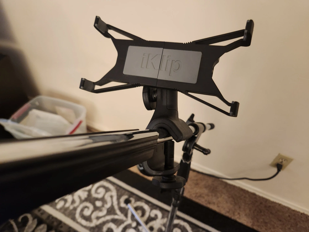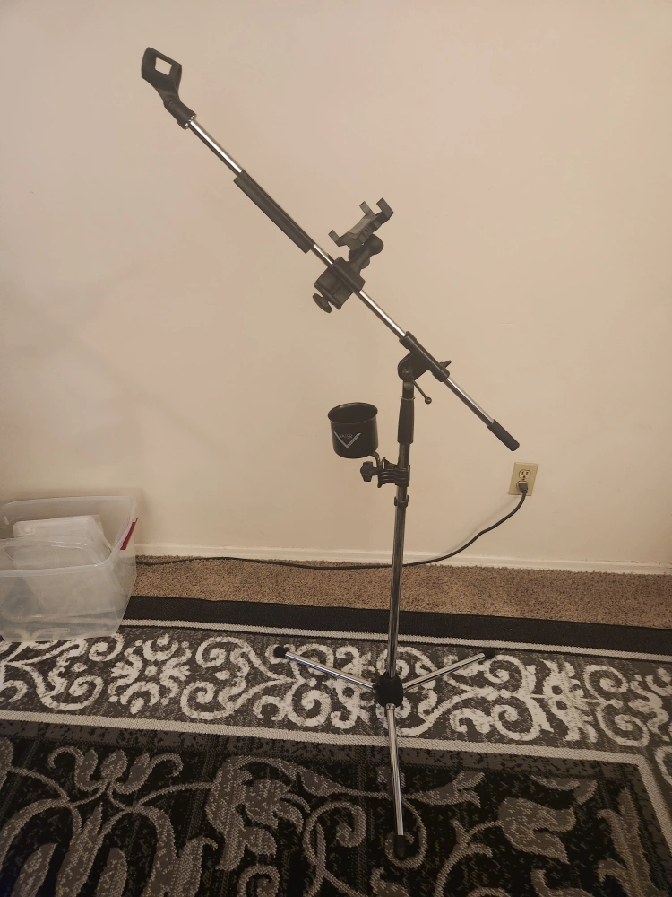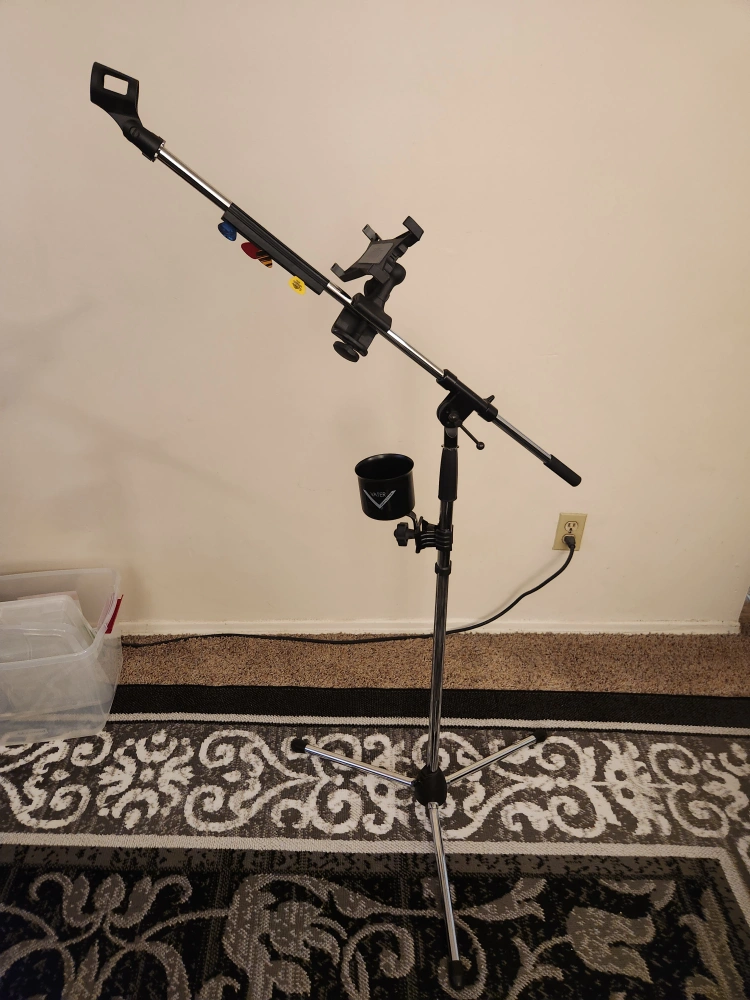 Boom mic stand. Comes with all the accessories. Mic Clip Cup (beer) holder Pick holder Tablet / Phone holder Folds up nicely. Everyone will be so impressed with all of your mic stand accessories! Price Firm. Pick-up Only. Cash Only