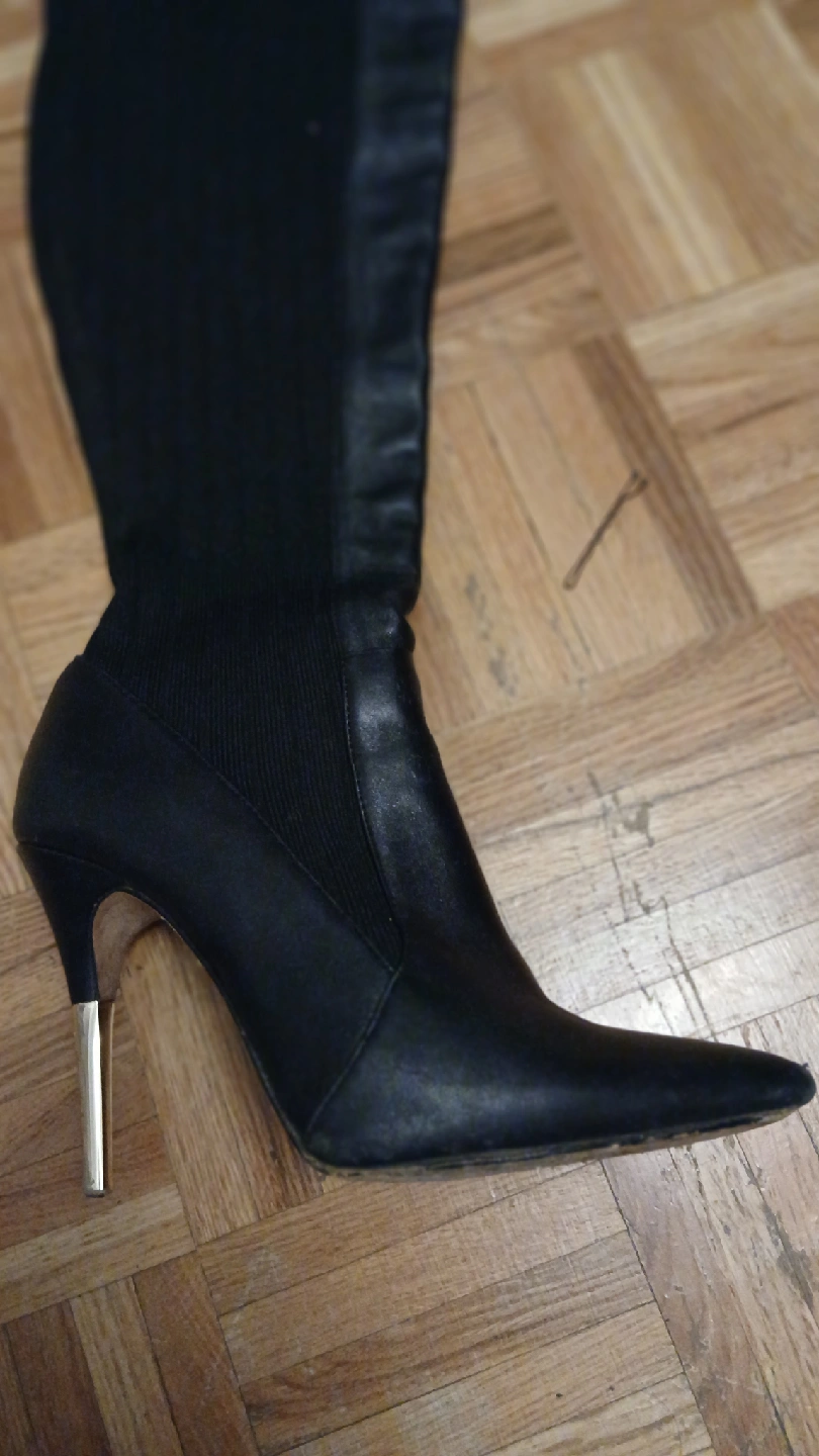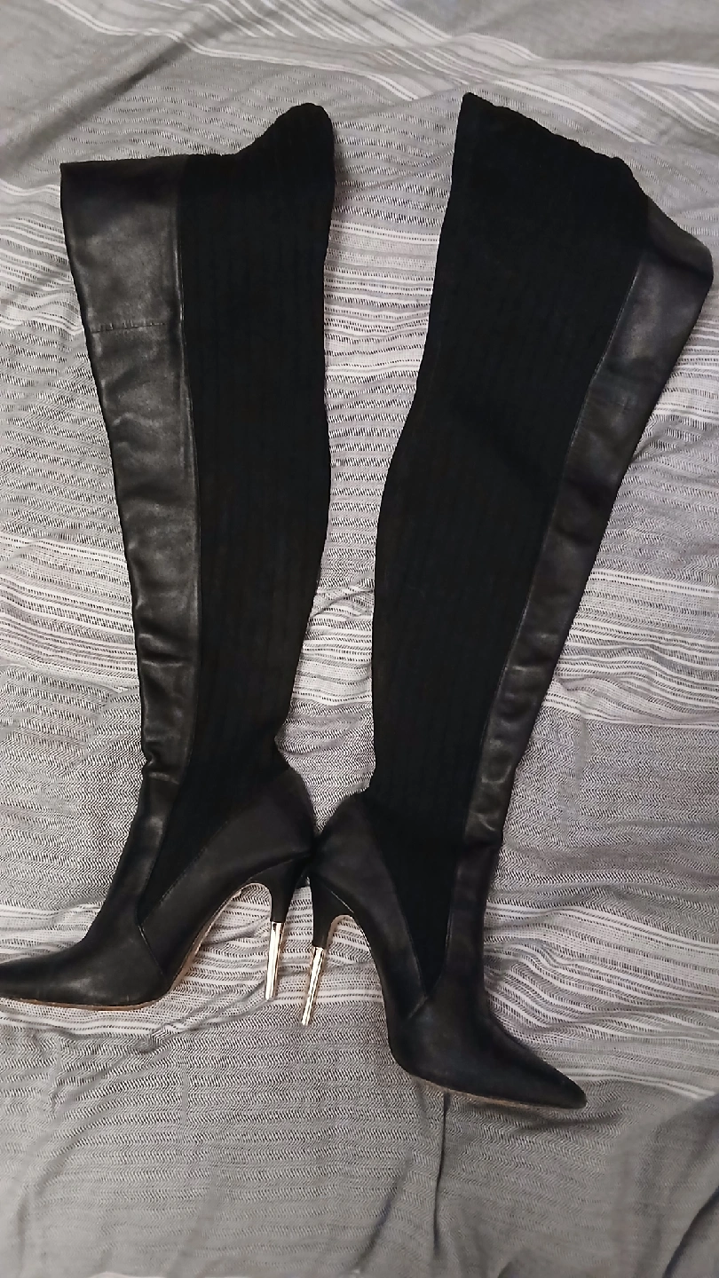 Je vends une paire de bottes hautes noires de marque PMSONNY. Elles sont en cuir et textile, de taille 7. Elles sont parfaites pour compléter une tenue élégante ou pour une soirée spéciale!