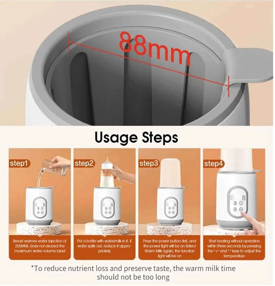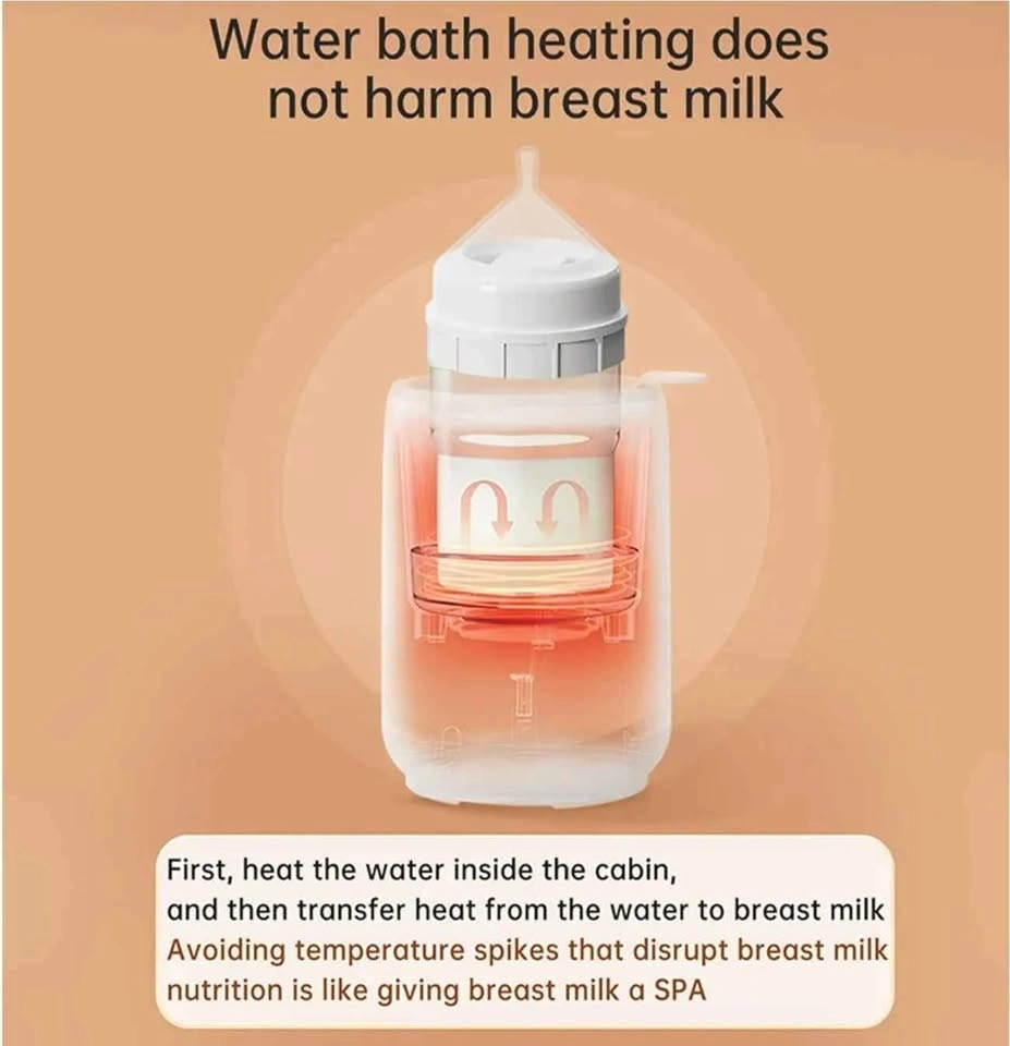 Smart Temperature Control: Features advanced smart temperature regulation to gently and evenly warm breastmilk and baby food, preserving essential nutrients and preventing overheating for safe feeding every time. Safe BPA-Free PP Material: Made from high-quality, BPA-free polypropylene (PP), this bottle warmer is safe for babies and easy to clean, ensuring health and hygiene with every use. Wide Compatibility: Compatible with most standard baby bottles and containers, making it a versatile solution for warming breastmilk, baby food jars, or formula bottles seamlessly. Portable and Lightweight: Compact and lightweight design makes this bottle warmer easy to carry and perfect for travel, allowing you to warm milk or food anytime, anywhere. Quick and Efficient Thawing: Designed to quickly thaw frozen milk or food without hot spots, saving time for busy parents while ensuring the optimal feeding temperature.