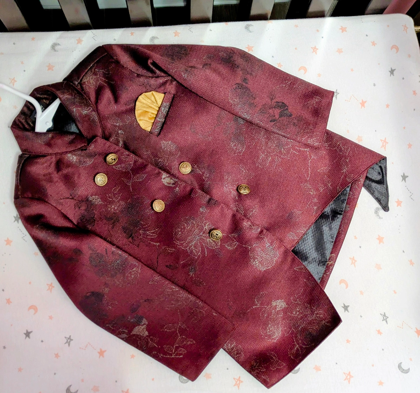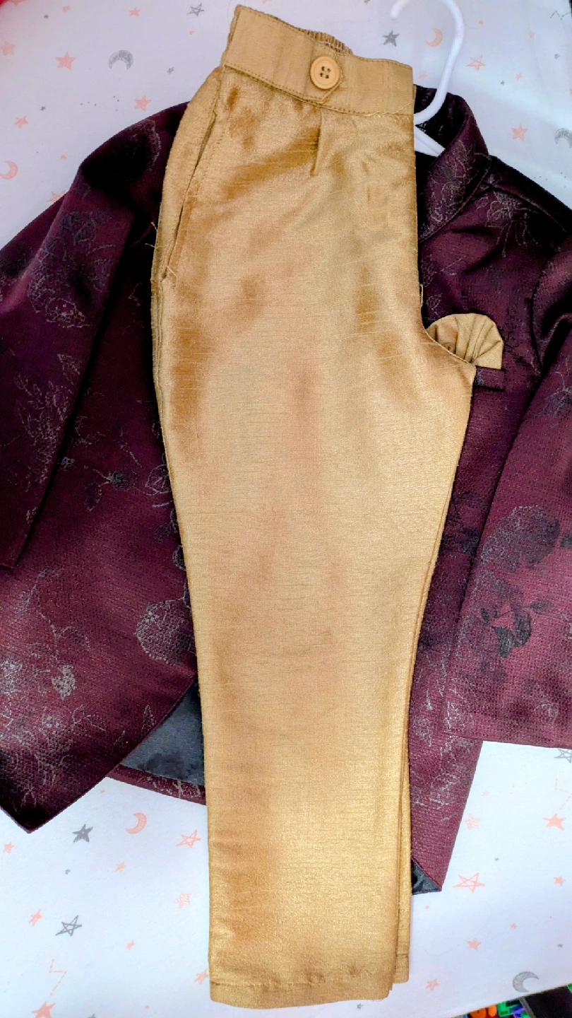 A charming burgundy floral suit set for boys! This set includes a double-breasted jacket with gold buttons and a matching pair of pants. Perfect for special occasions or a stylish everyday look Diwali and Navrathri outfit