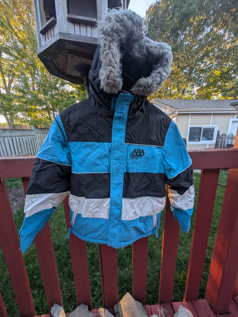 Boys size small (7) West 49 winter jacket. Zipper and velcro front, 2 pockets with zippers. Hood is not removable, has faux fur trim that is removable. Has 1 inner pocket, elastic waist with 2 settings, has loop fasteners to attach to winter pants if desired. Inside sleeves has a sleeve extension seam that has not been extended to make sleeves 1.5-2 inches longer.