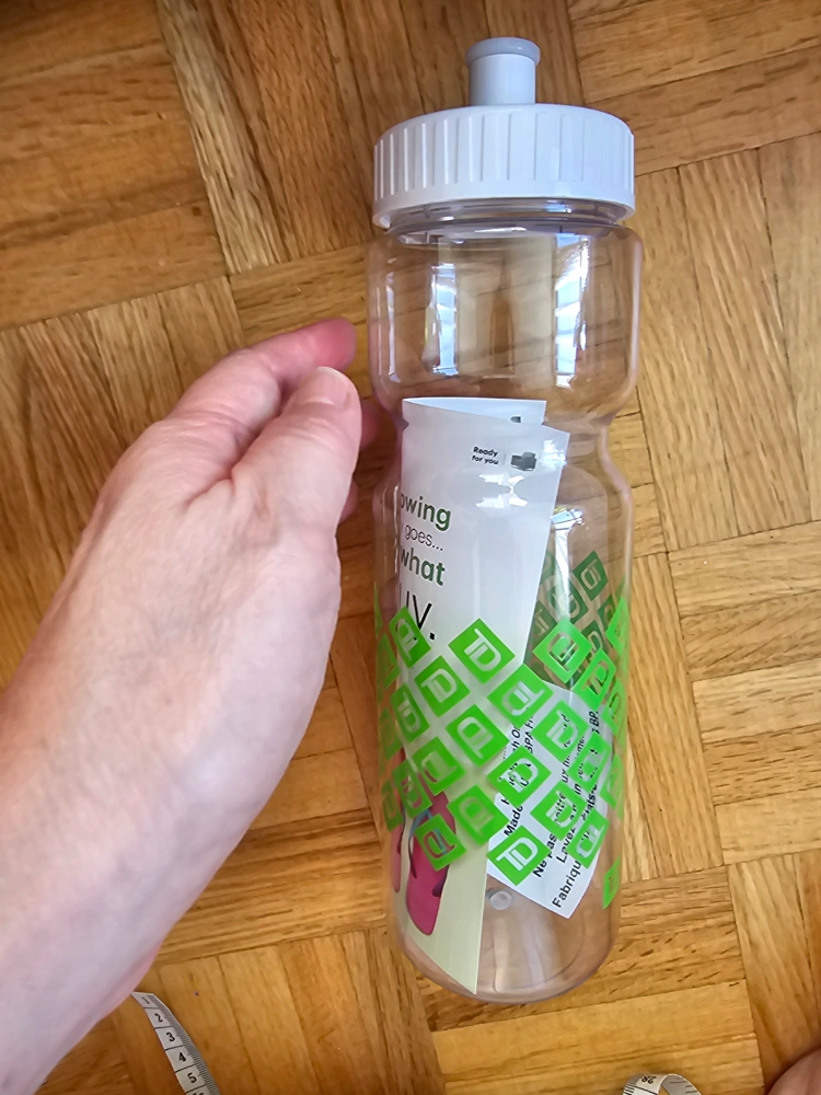 I'm selling a new BPA free 26 cm or 10 inches water bottle. It's clear with a white lid and green accents. Perfect for staying hydrated on the go!