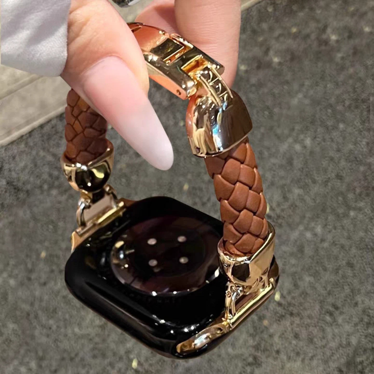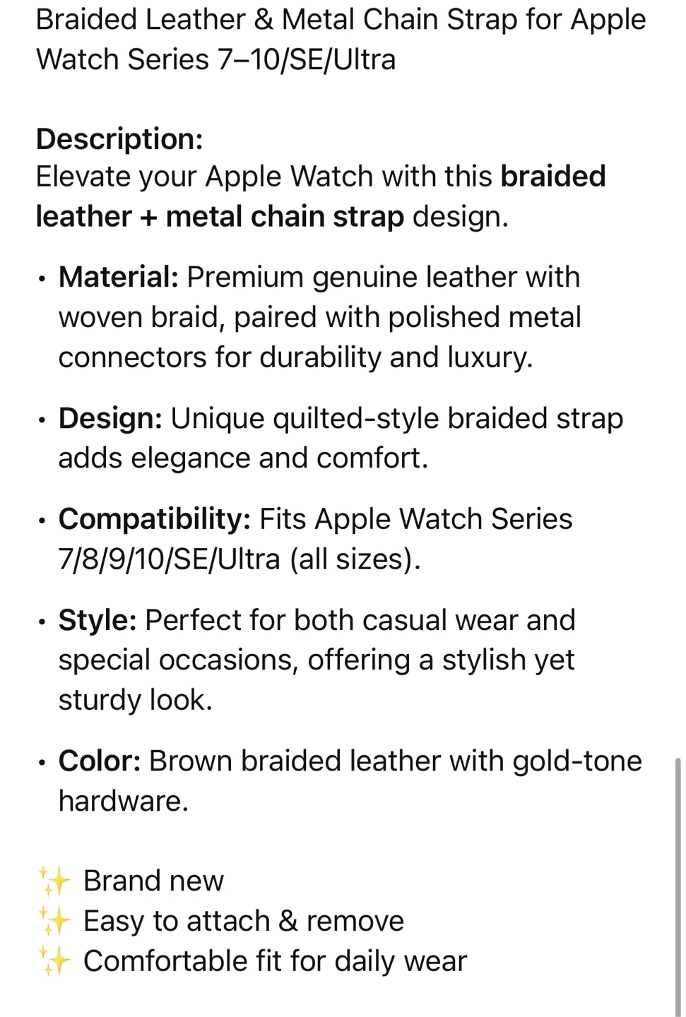 Elevate your Apple Watch with this braided leather + metal chain strap design. • Material: Premium genuine leather with woven braid, paired with polished metal connectors for durability and luxury. • Design: Unique quilted-style braided strap adds elegance and comfort. • Compatibility: Fits Apple Watch Series 7/8/9/10/SE/Ultra (all sizes). • Style: Perfect for both casual wear and special occasions, offering a stylish yet sturdy look. • Color: Brown braided leather with gold-tone hardware. ✨ Brand new ✨ Easy to attach & remove ✨ Comfortable fit for daily wear