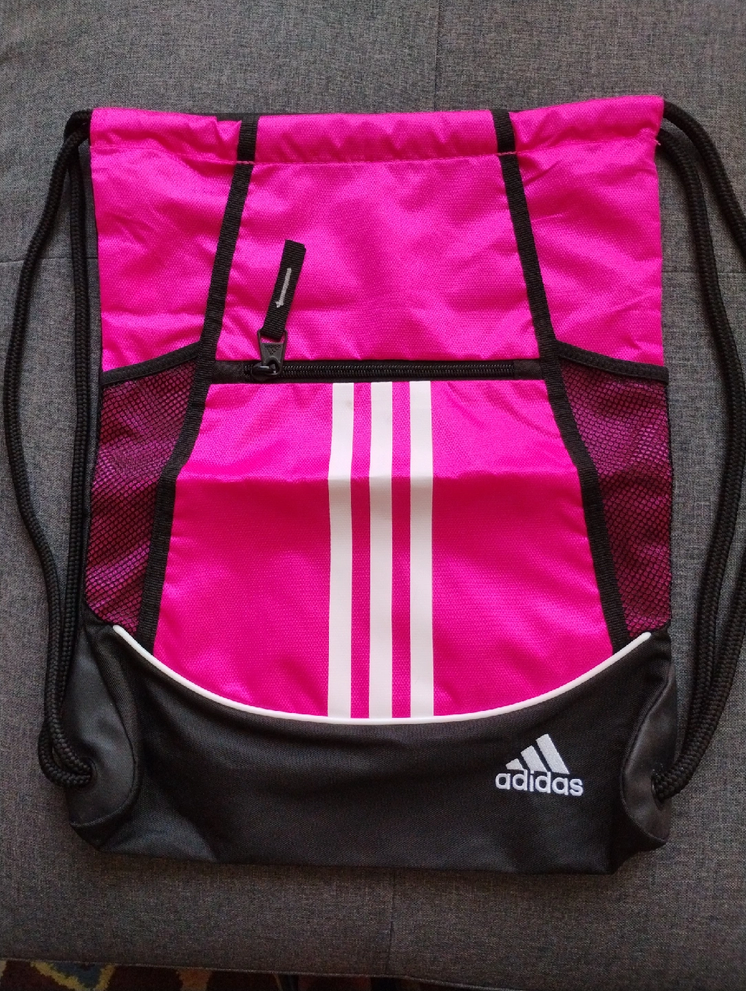 Here's a brand new never used Adidas drawstring backpack in a vibrant pink and black colour combo! It's perfect for carrying your gym clothes or everyday essentials. Features the classic three-stripe design and a handy front zipper pocket. cash only.