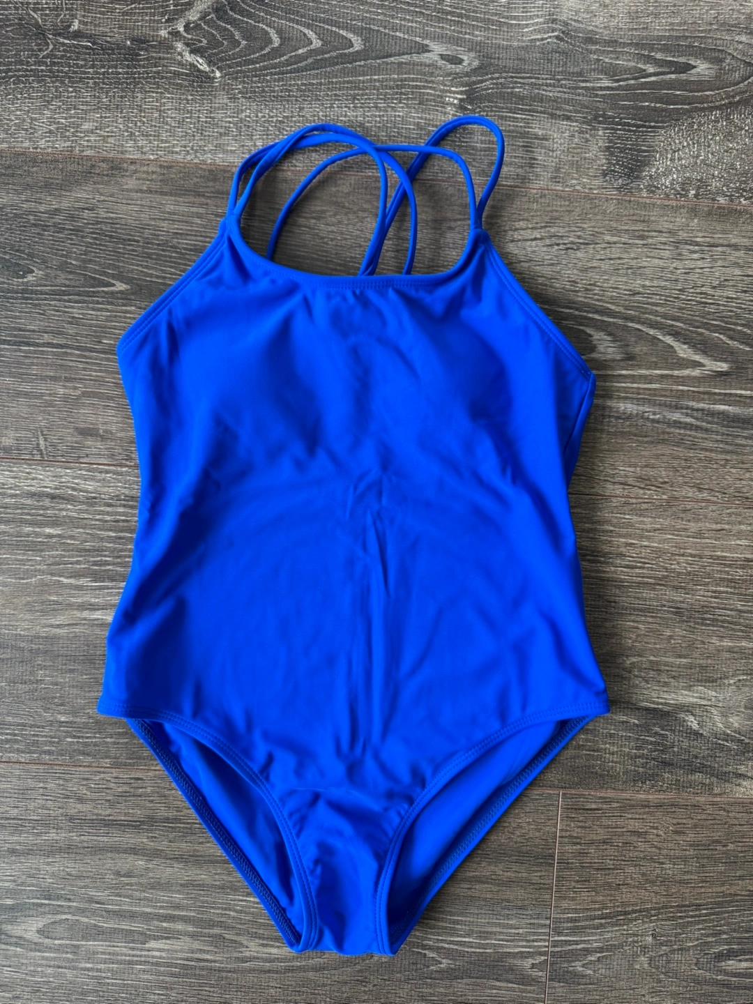 Women's one-piece swimsuit. Bright blue colour. Cross-back straps. Simple, classic style.