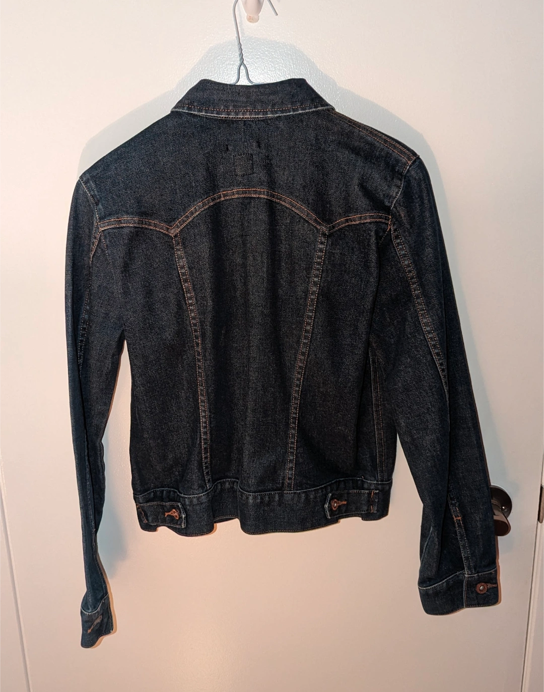 Selling a Gap denim jacket in new condition! It's a dark wash with a bit of stretch, making it super comfy. The size is M/M, perfect for layering or wearing on its own. It's a classic piece that goes with everything