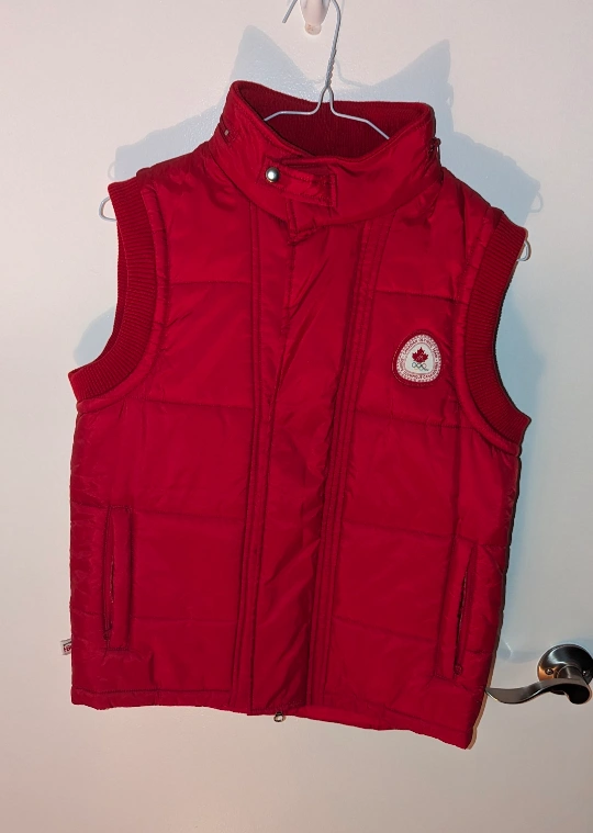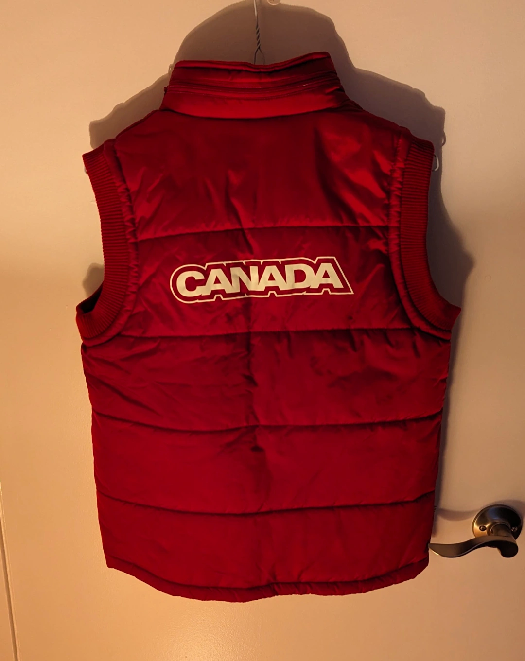 Selling a vibrant red HBC Canada Olympic vest! It's in brand new shape and perfect for showing off your Canadian pride. The size is youth 14/16, and it's made with 100% nylon shell and 100% polyester lining and filling
