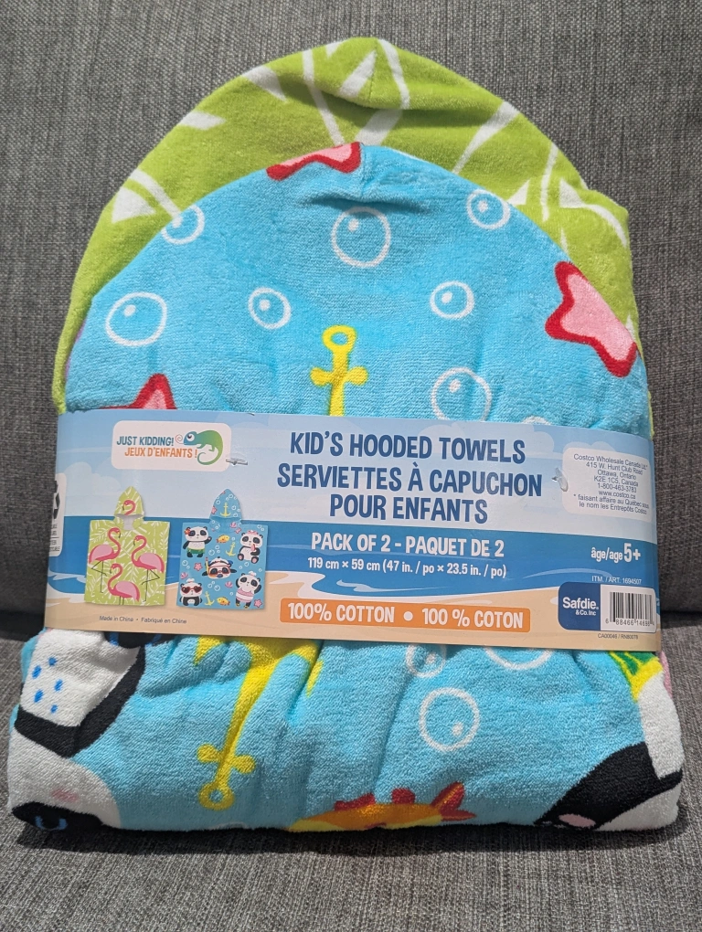 Brand New kid's hooded towels come in a pack of 2. They're made of 100% cotton. Each towel measures 119 cm x 59 cm (47 in. x 23.5 in.)