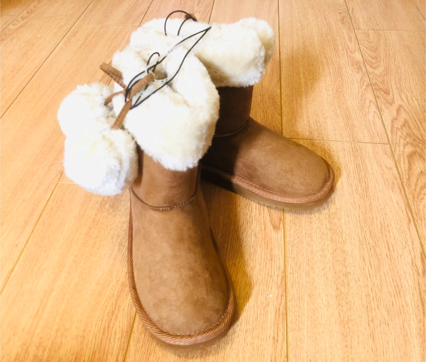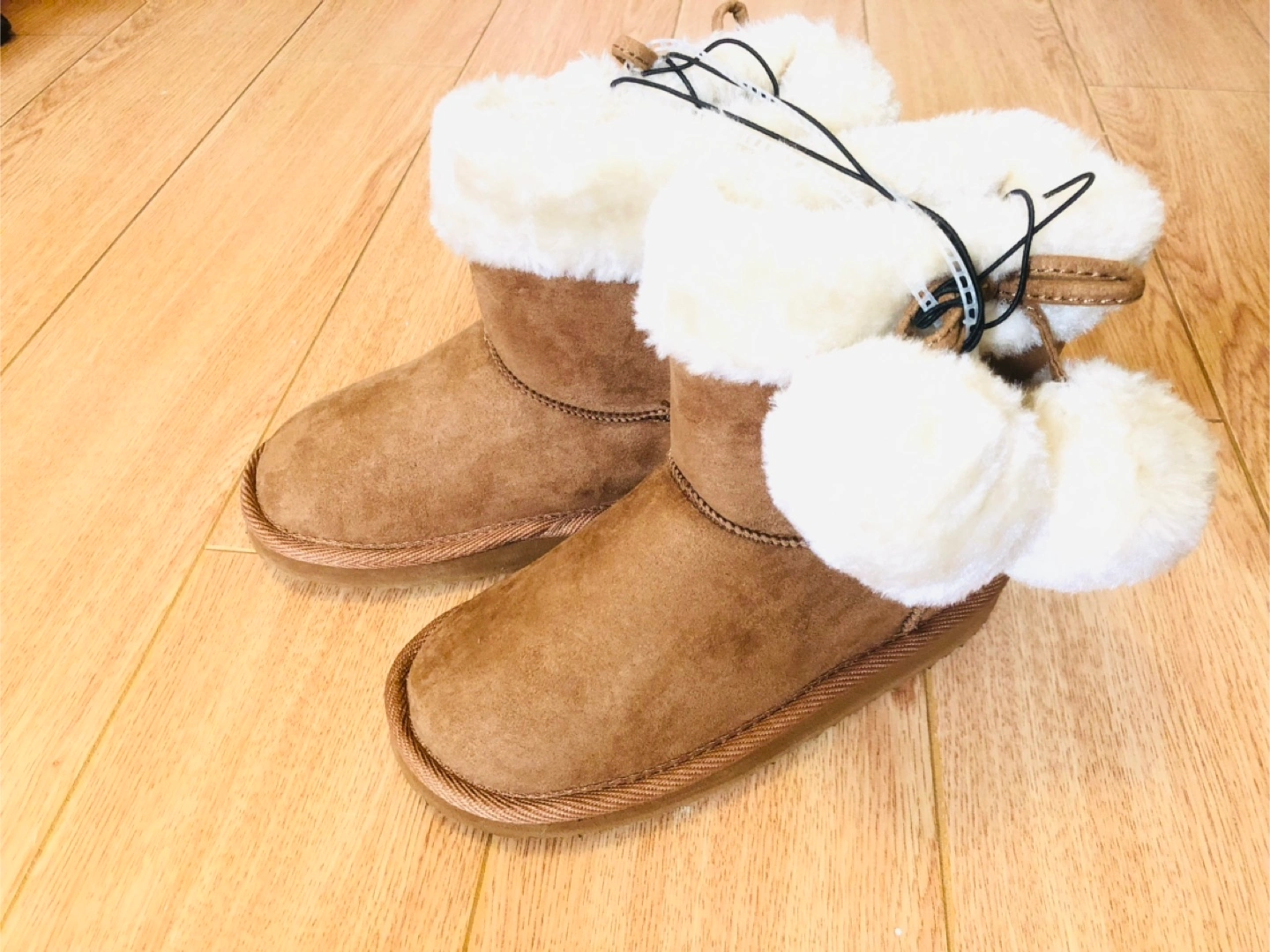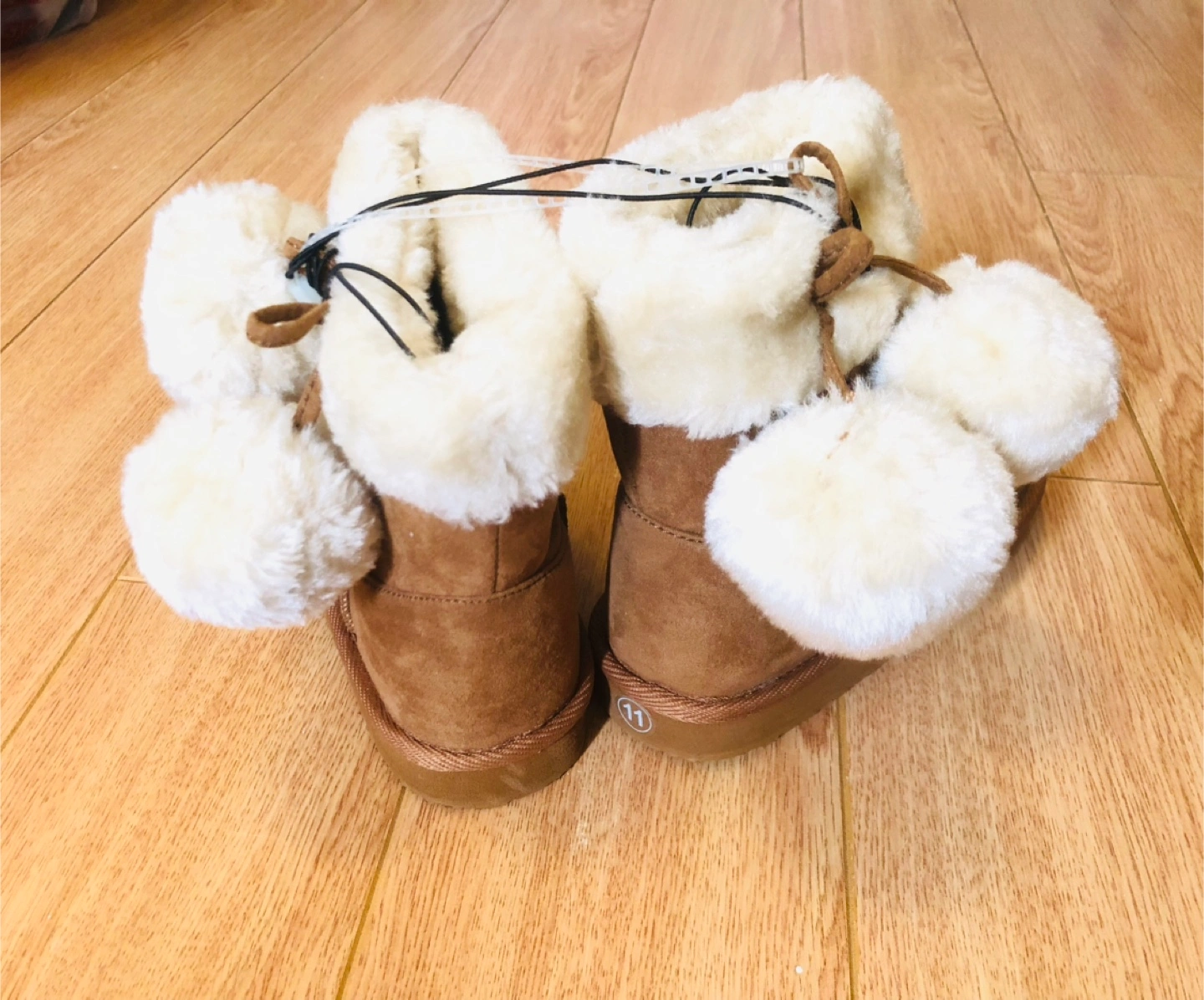 A pair of kids' size 11 for your cuties. It features a soft, fluffy lining and cute pom-pom details. Perfect for keeping little feet warm and stylish during the colder months.