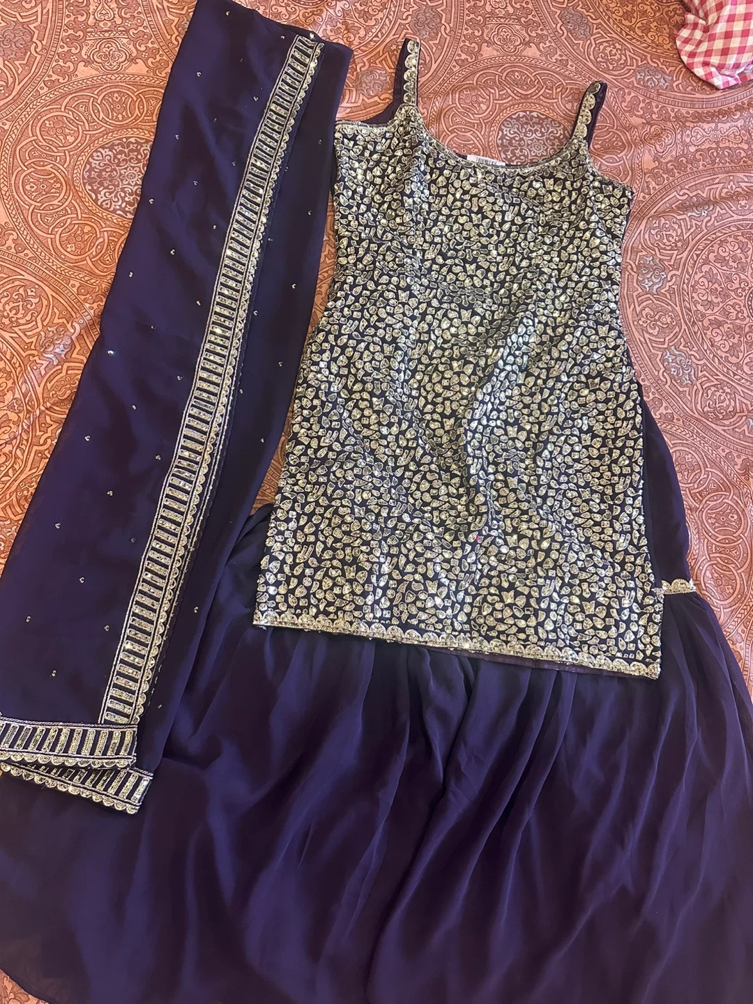 Brand new Beautiful purple Indian suit with intricate embellishments! This set includes a top, bottom, and dupatta. Perfect for a special occasion or festive event. The fabric is lightweight and comfortable, making it easy to wear. The colour is a rich, deep purple that looks great in any light