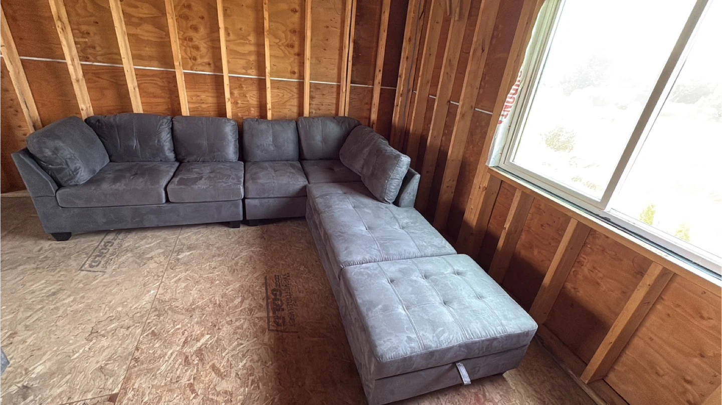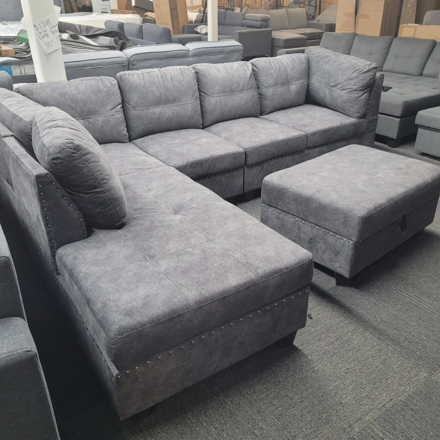 Selling a brand new comfy grey sectional sofa that comes with a matching ottoman. It's in great shape and would be perfect for a living room or den. The ottoman also provides extra storage space! Comes in light grey or dark grey with metal studs
