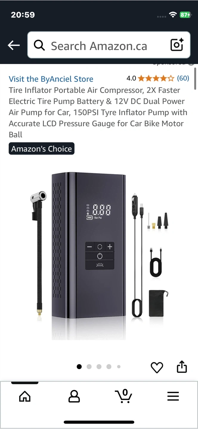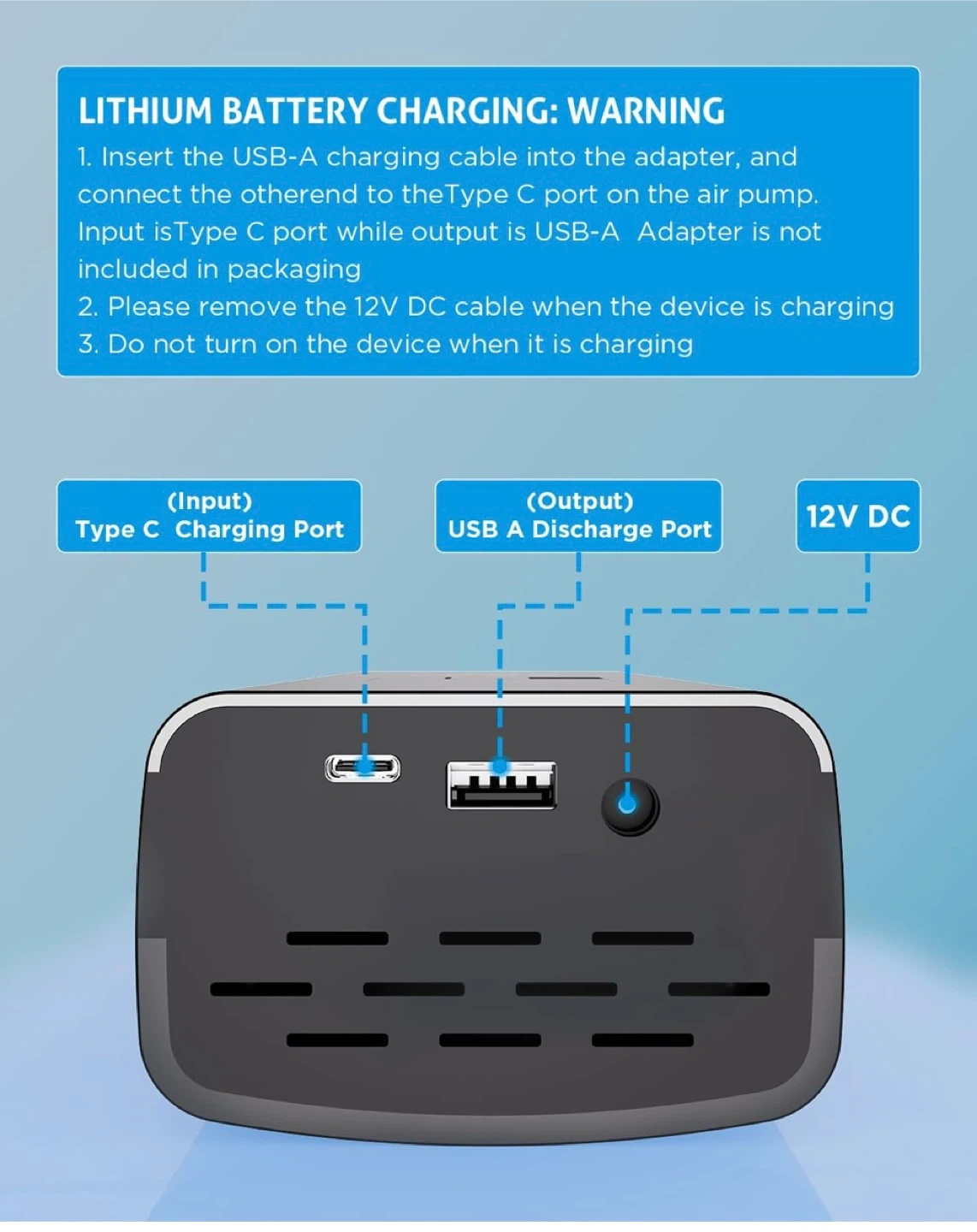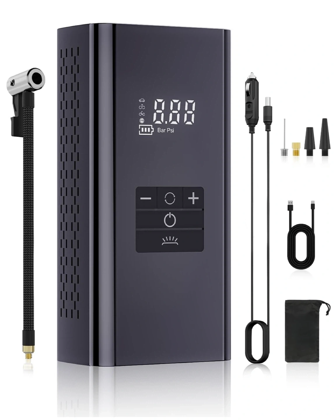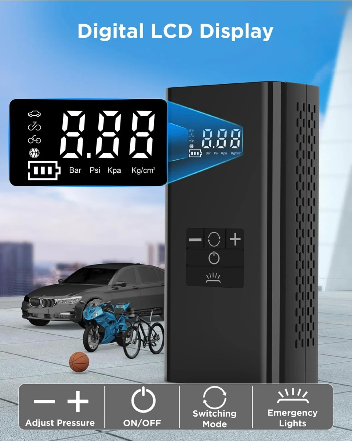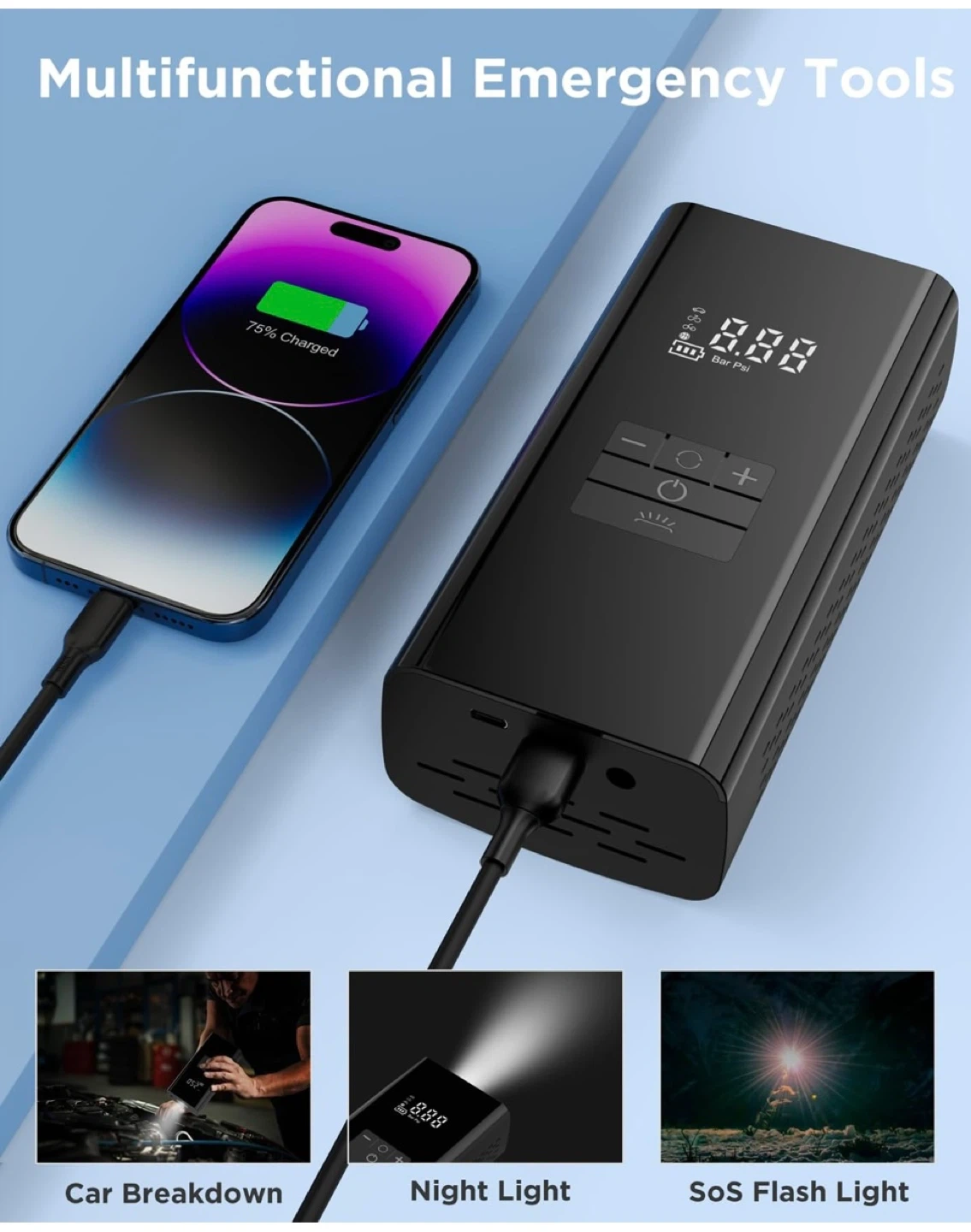 🌷Brand new in box!! Can open for check! Price firm.. Tire Inflator Portable Air Compressor, 2X Faster Electric Tire Pump Battery & 12V DC Dual Power Air Pump for Car, 150PSI Tyre Inflator Pump with Accurate LCD Pressure Gauge for Car Bike Motor Ball 【2 WAYS TIRE INFLATOR】This portable tire inflator comes with built-in rechargeable & large-capacity battery 6000mAh (2000mAh*3)which can handle multiple inflations on a full charge. Upgraded multi-purpose tire inflator air compressor support type-C charging and bundled with a backup of 12V DC power supply even when the batteries run out, you can connect it to the car cigarette lighter plug for power and inflate your car tires directly for road rescue emergencies (Please note: This method cannot charge the air pump because the voltage is too high) 【2X FAST INFLATION & 4 ADJUSTABLE MODES】 Byanciel tyre inflator air pump can set the air pressure up to 150psi with a 45L/min output volume for quickly inflate your car tire in just a few minutes, saves you valuable time. The air compressor choose from 4 modes: PSI, BAR, KPA, KG/cm², with 4 additional nozzles to meet the inflation needs of cars, bicycles, balls, motorcycles, etc. our electric tyre pump features a lightweight pure copper motor for improved performance. The durable lightweight plastic and strong hose can withstand high pressure. 【AUTO SHUT OFF & LCD DISPLAY】 The HD LED screen digital display shows real-time and preset pressure values. Simply preset your desired tire pressure on the digital display screen, and the inflator will automatically inflate the tire to the desired pressure. Once the preset pressure value is reached. the tire inflator will automatically stop inflating, providing a safe, quick, and reliable user experience. 【3 in 1 MULIFUNCTIONAL DEVICE】 This car accessories is not just an inflatable pump but also a useful power bank for charging mobile phones and other devices. Come with Super bright LED light with 3 lighting modes (Press once will turn on the LED light, press two emergency light, press three Flash) make it helpful for roadside emergency and nighttime use. Cordless design with compact size make it very suitable for using during travel or at home. 【WHAT YOU GET】1x tire inflator, 1x USB charging cable, 1x Bicycle conversion head, 1x Ball needle, 1x swim ring conversion head, 1x Rubber boat conversion head, 1x Air hose (can be used to inflate vehicles directly), 1x Pump storage bag, 1x User manual, 1X Car cigarette lighter cord.