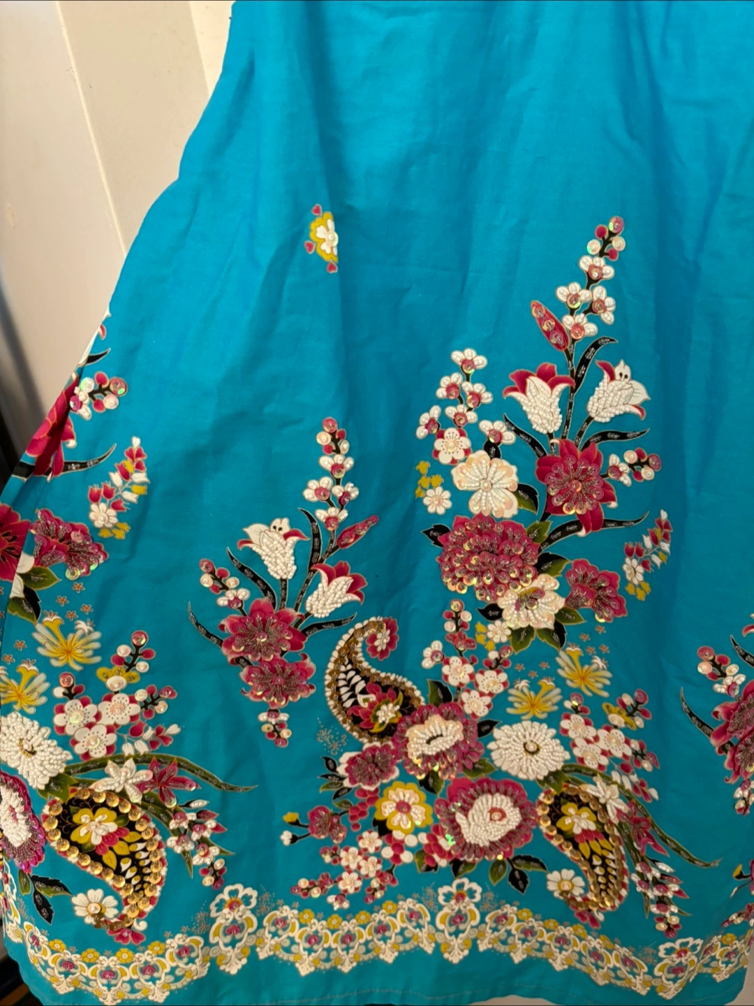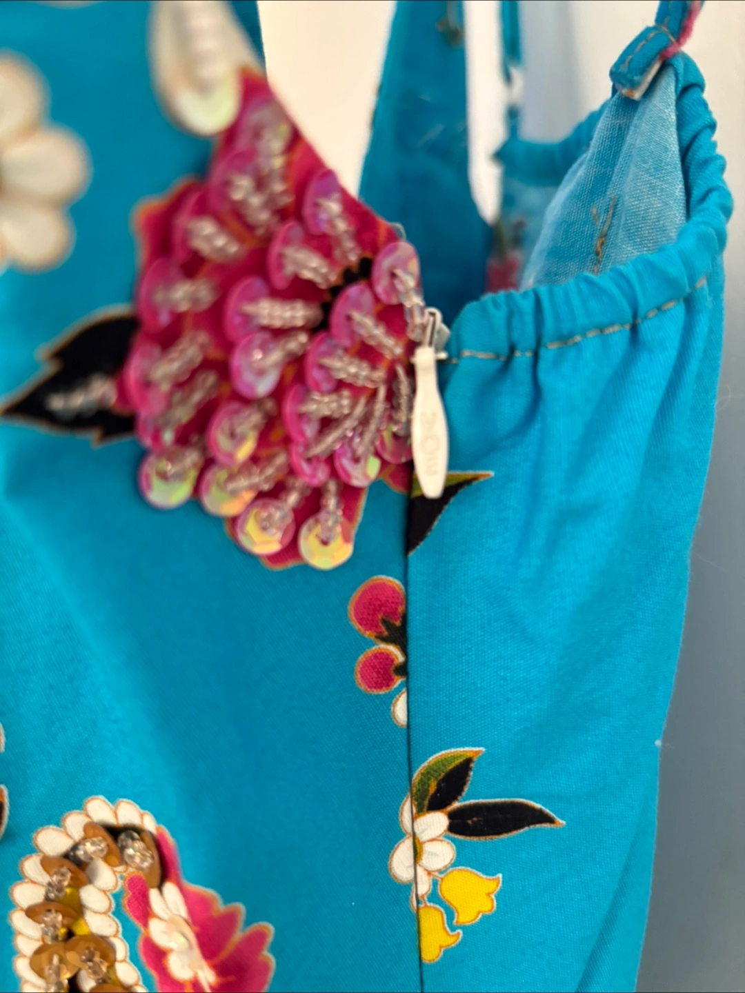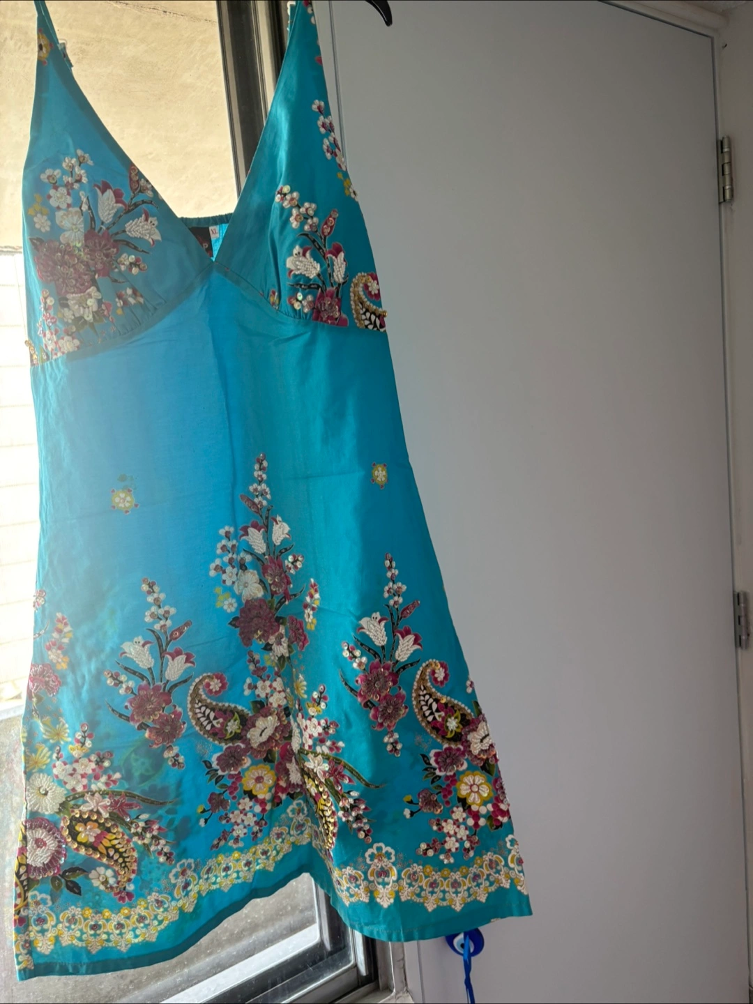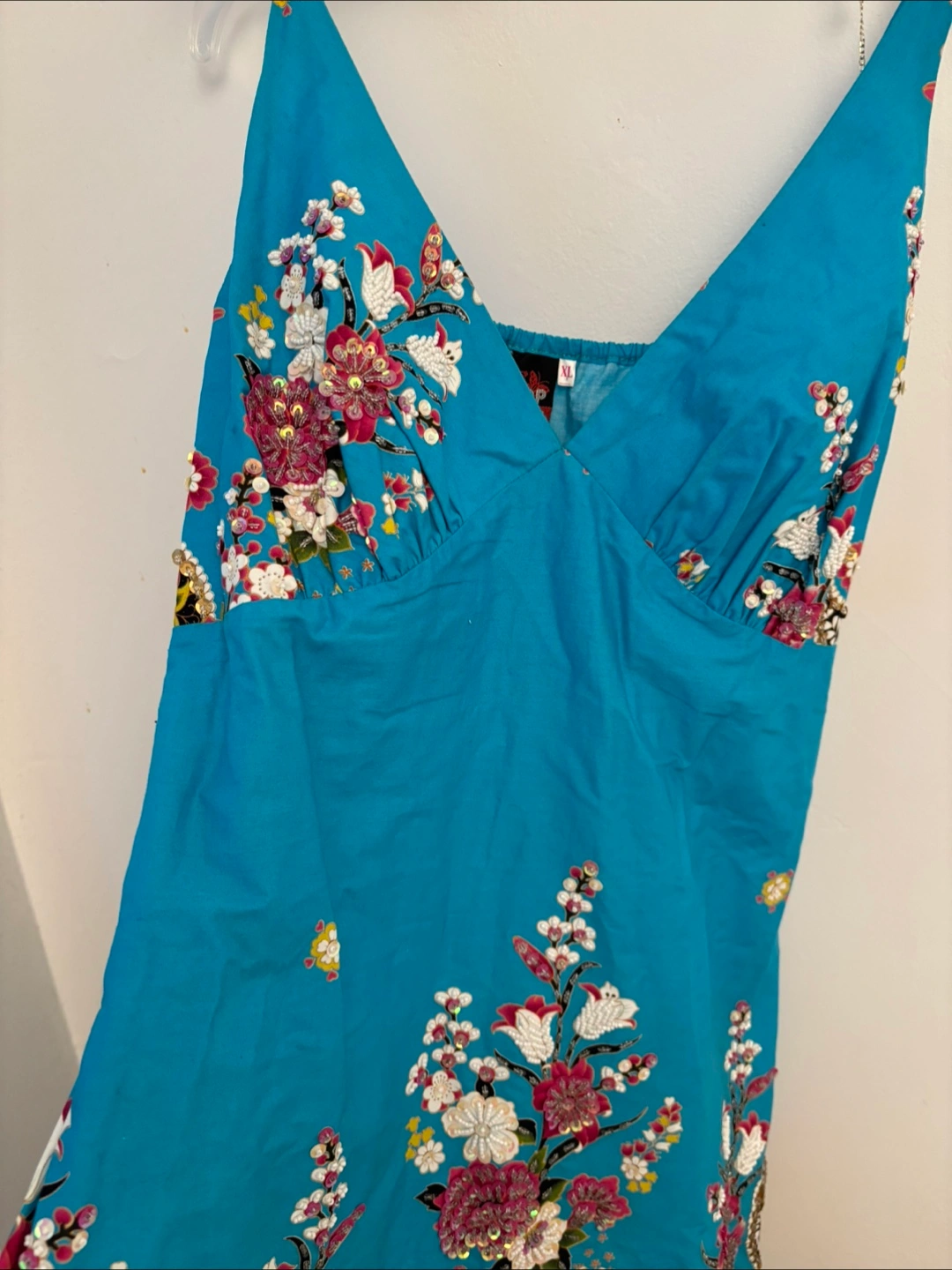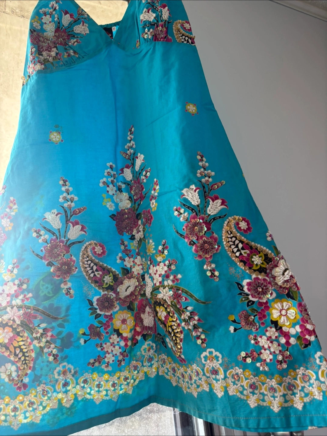 A vibrant soft turquoise dress with a beautiful floral pattern and sequin detailing. It's a size is S and perfect for Medium Small sizes. Never worn! Hand made embroidery! Perfect for adding a pop of colour to your wardrobe! Suitable for dinners, festive outings, small parties, and as you like! Very comfortable, too! Adjustable straps. No pets and no smoke house. Pick up from a public place or I can ship at your cost! Price: 200$