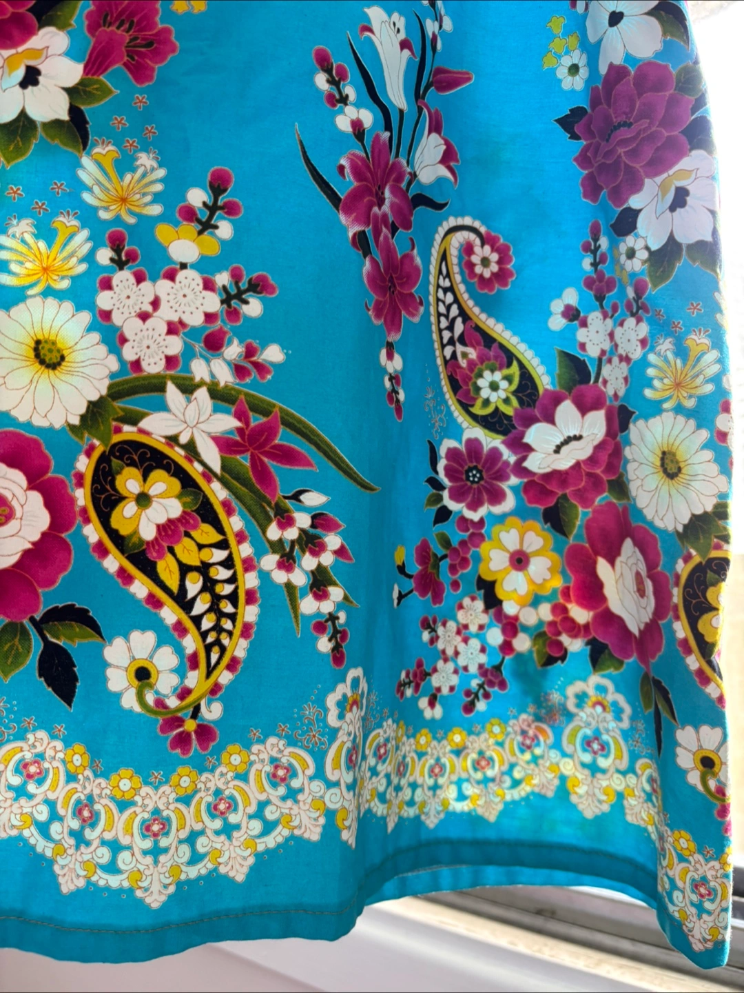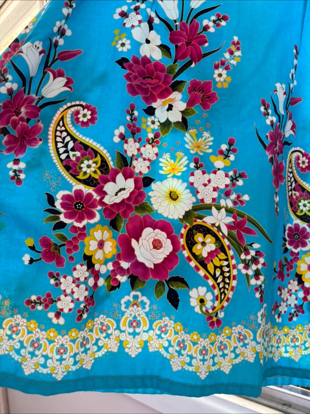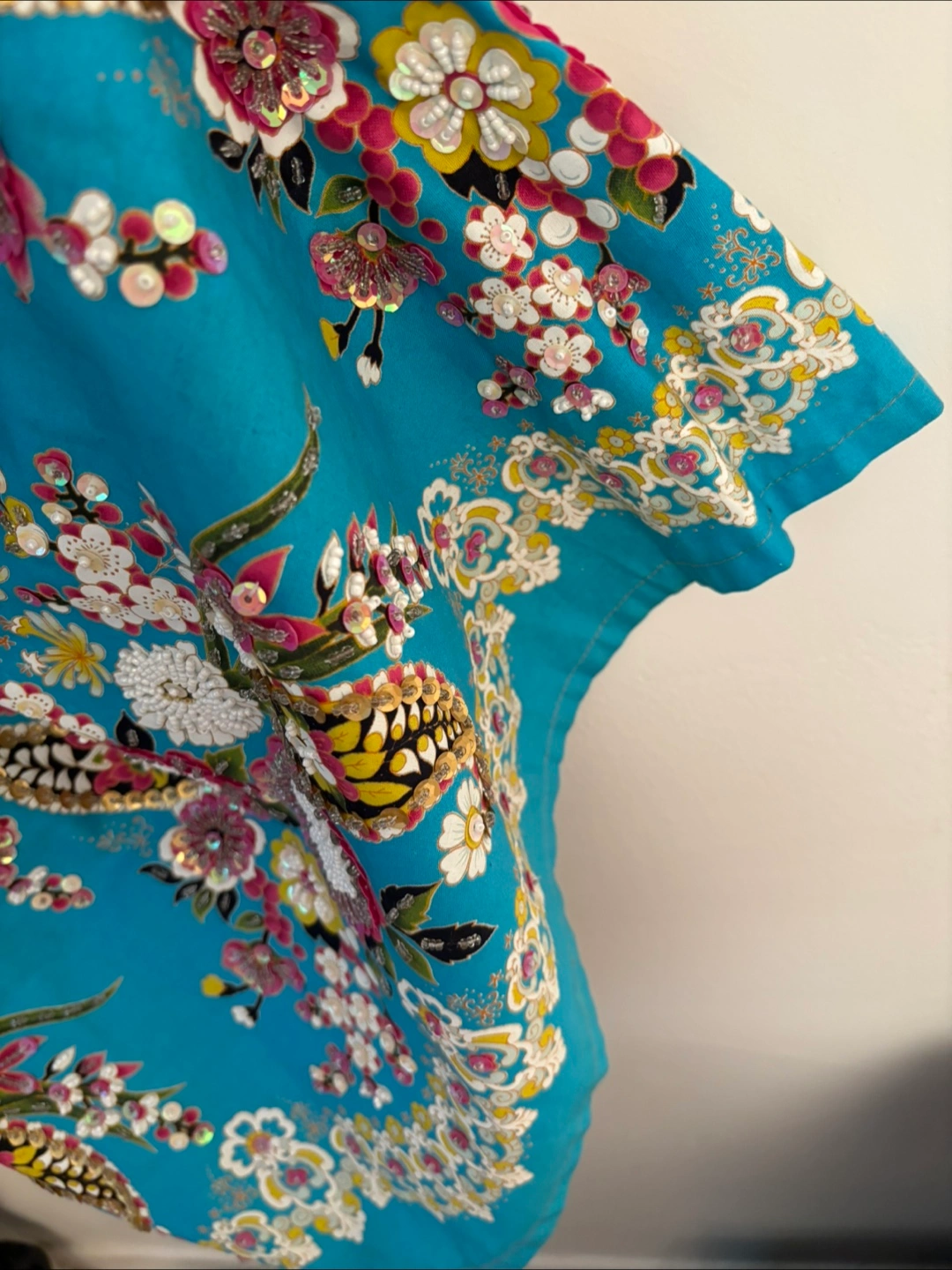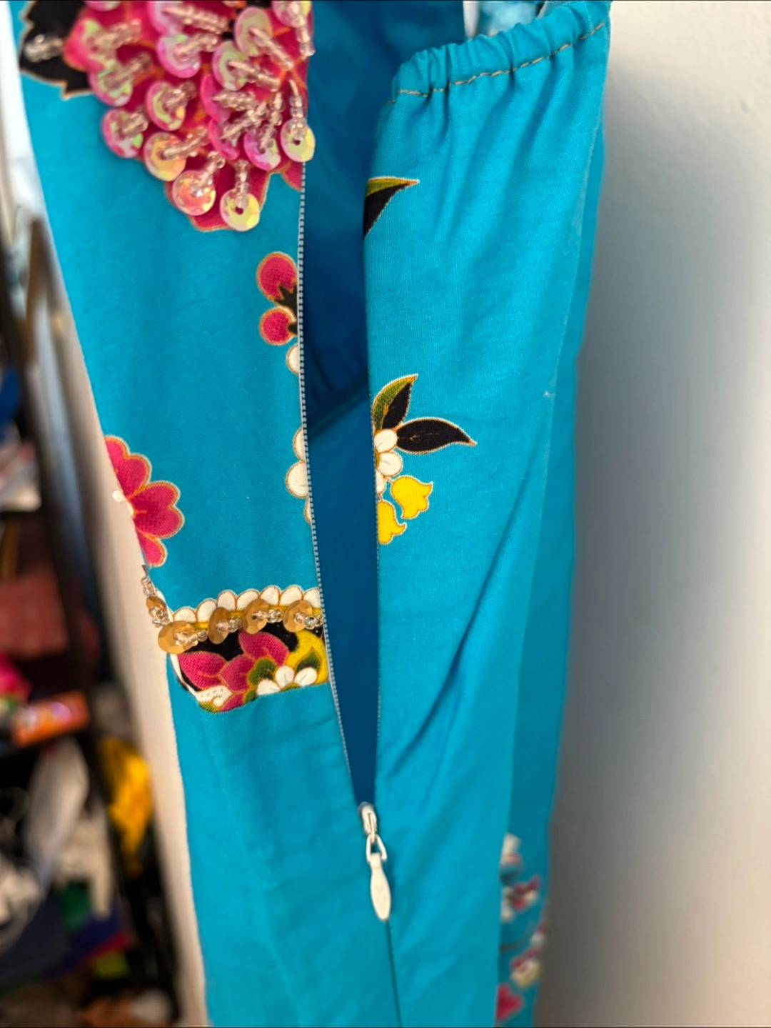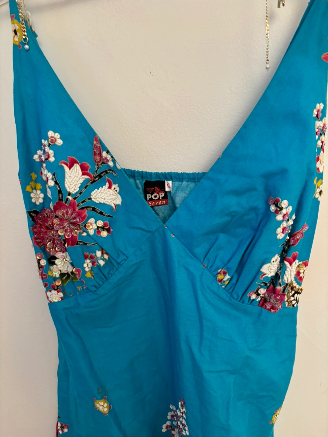A vibrant soft turquoise dress with a beautiful floral pattern and sequin detailing. It's a size is S and perfect for Medium Small sizes. Never worn! Hand made embroidery! Perfect for adding a pop of colour to your wardrobe! Suitable for dinners, festive outings, small parties, and as you like! Very comfortable, too! Adjustable straps. No pets and no smoke house. Pick up from a public place or I can ship at your cost! Price: 200$
