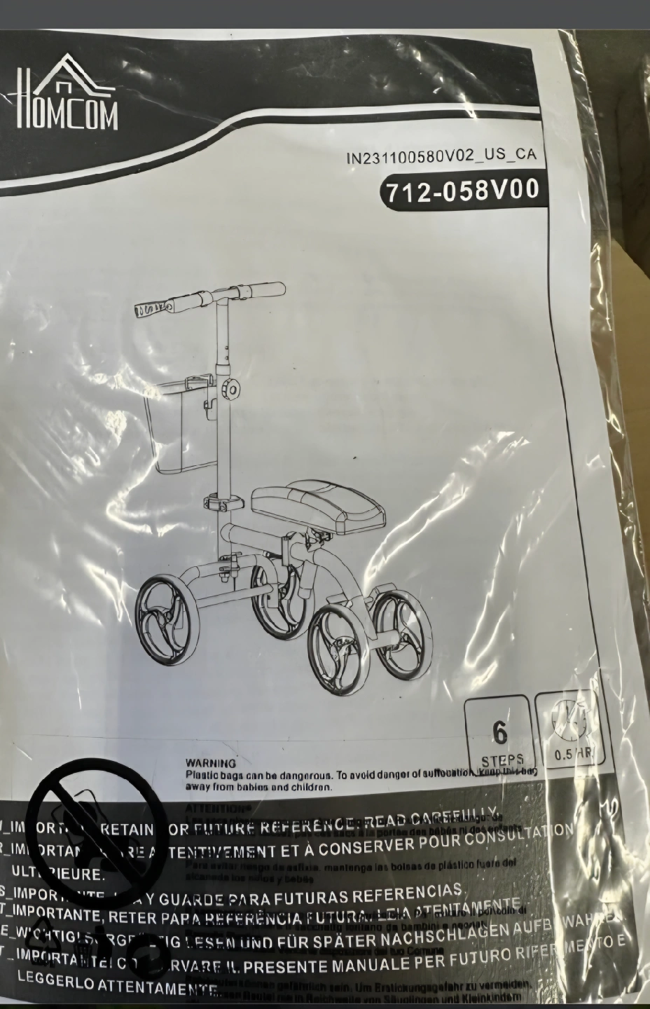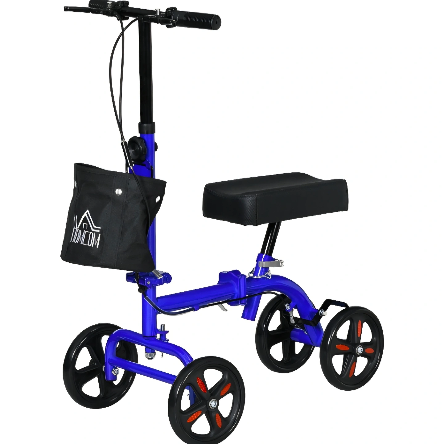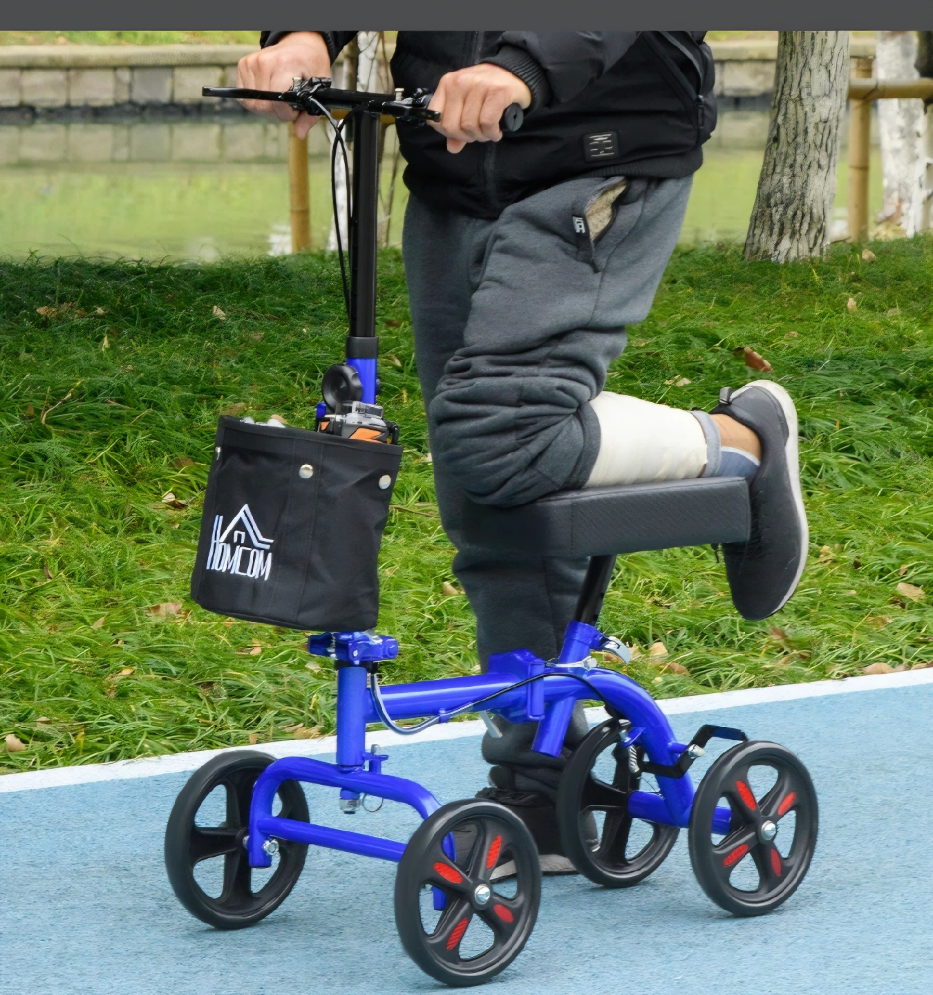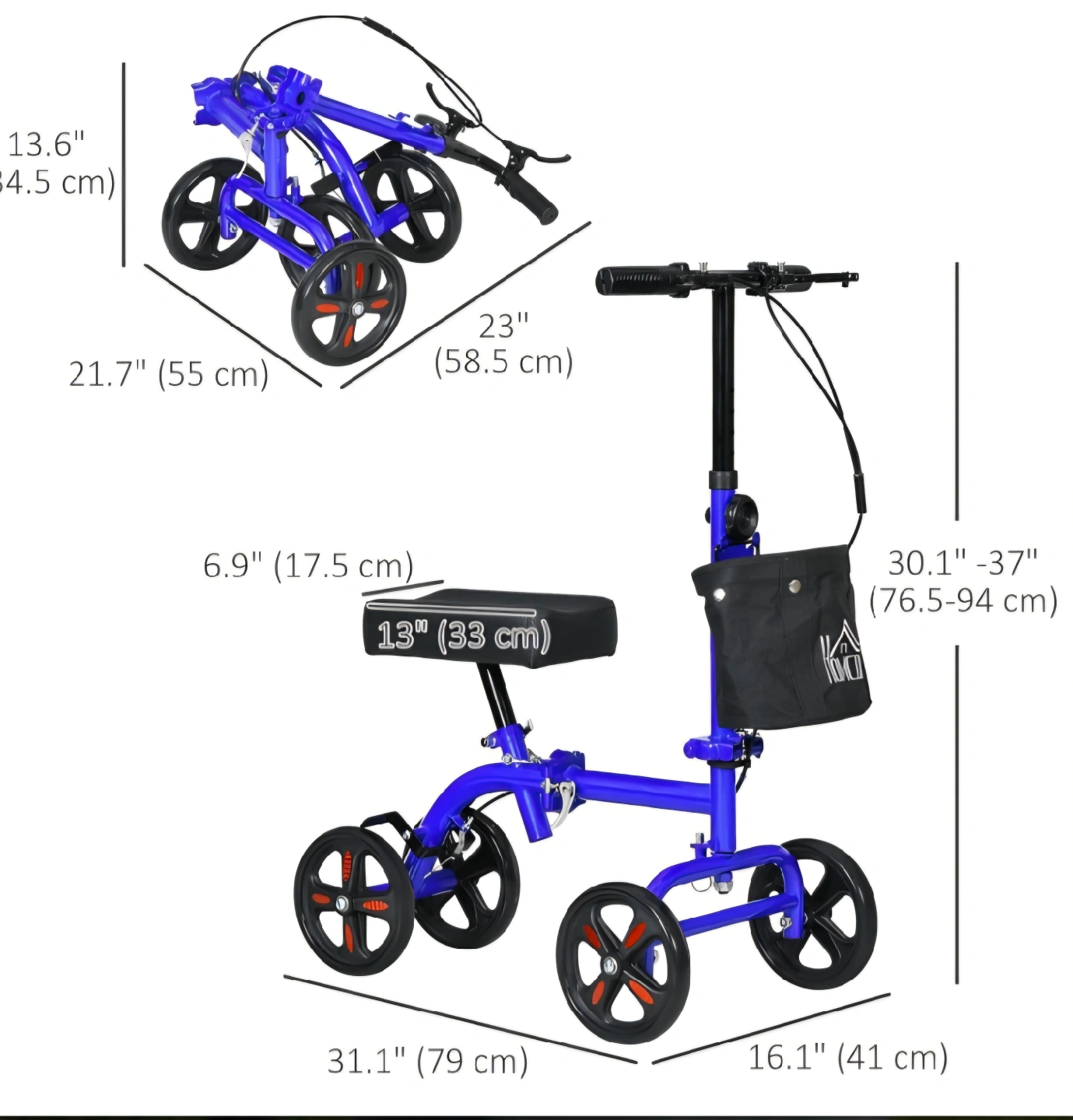 Selling a HOMCOM knee walker scooter in blue! It's in great condition and ready to help you get around while recovering. Key specs: - Dimensions: 31.1" (79 cm) length, 16.1" (41 cm) width - Adjustable height: 30.1" - 37" (76.5-94 cm) - Seat size: 13" (33 cm) Comes with a handy HOMCOM bag for carrying your essentials!