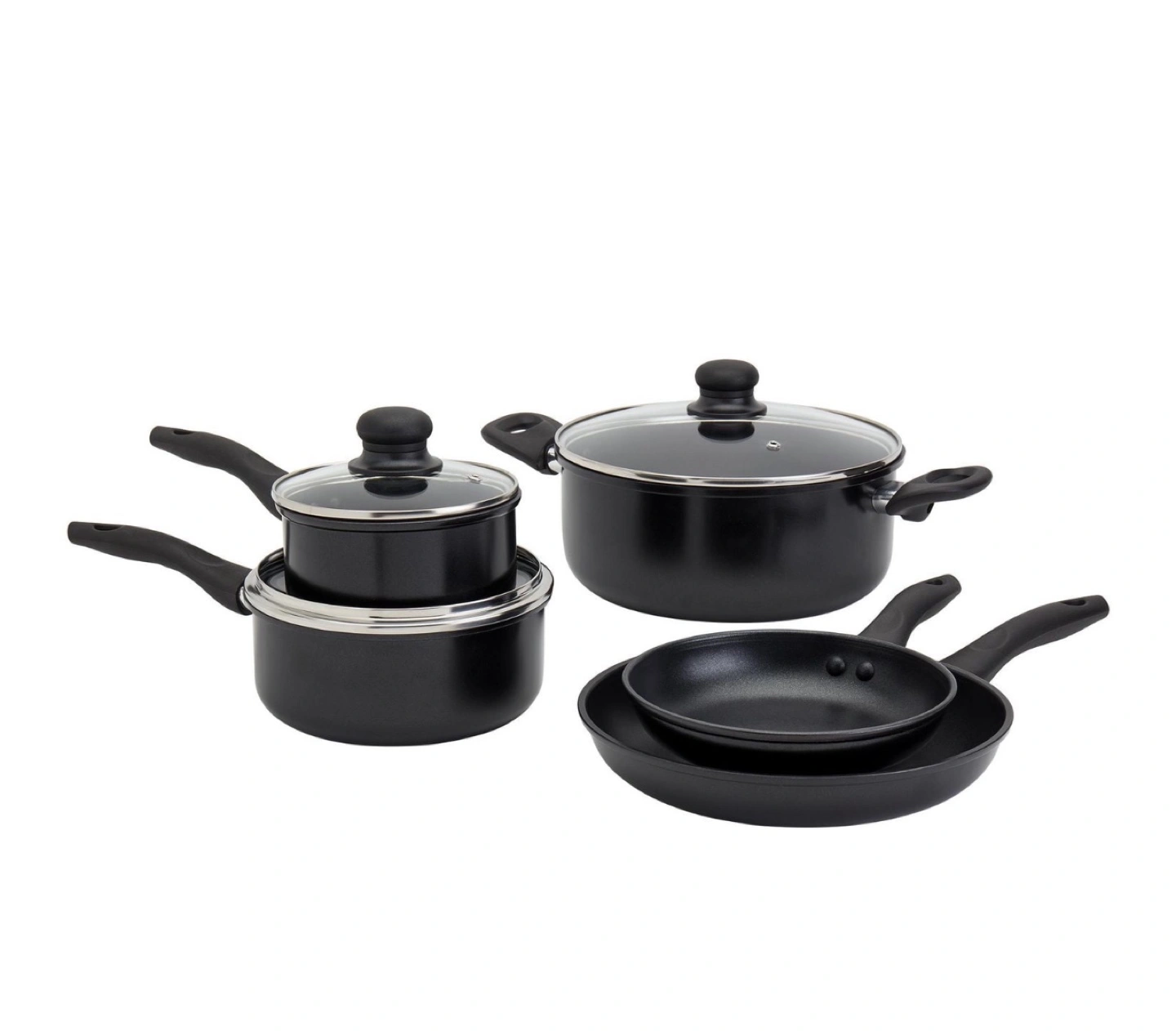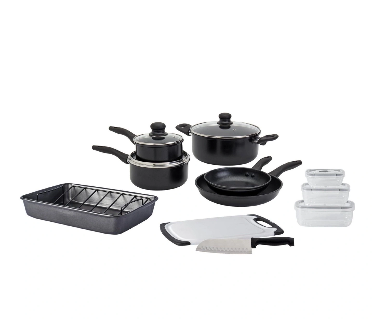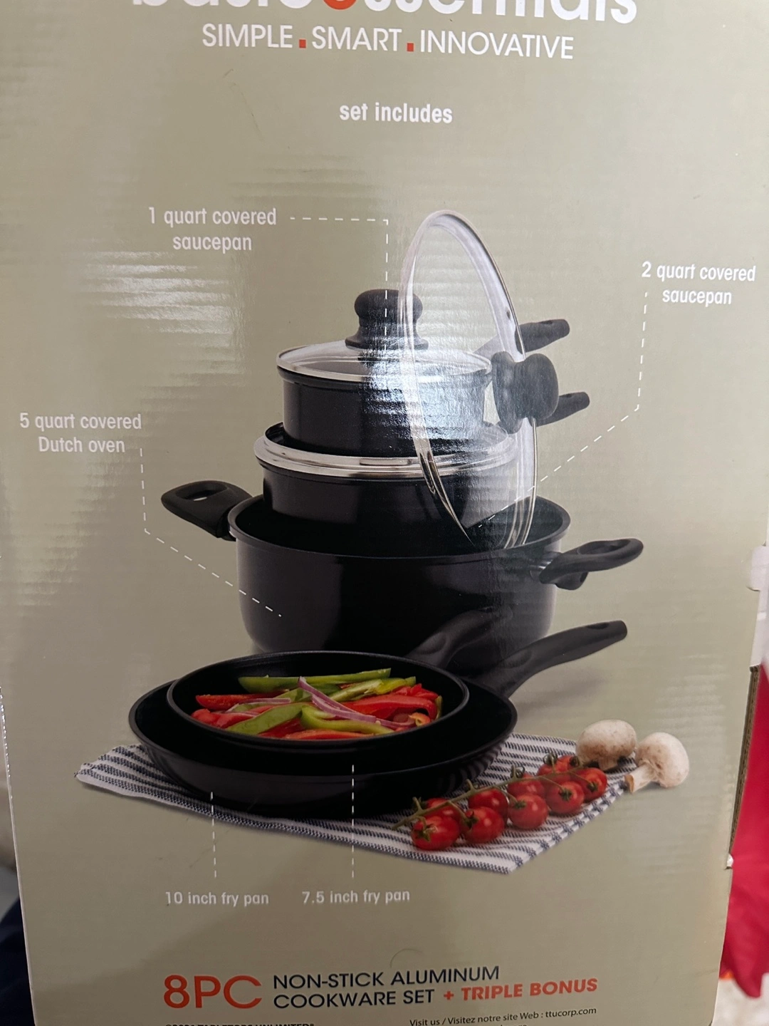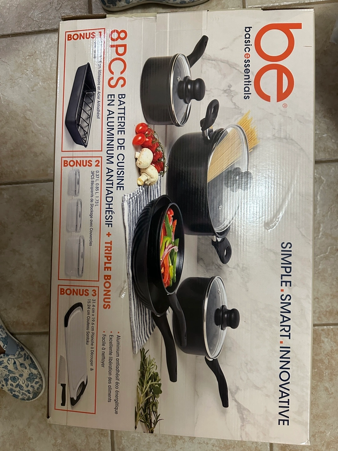 Mississauga, Brandnew Basic Essentials 8 Piece Cookware Set 8Pc Cookware Set + Triple Bonus. $80 Consists of: 1Qt/.94L Covered Saucepan, 2Qt/1.89L Covered Saucepan, 5Qt/4.73L Covered Dutch Oven, 7.5"/19cm Fry pan, 10"/25.4cm Fry pan, 13"/33cm x 9"/22.8cm Roaster with Rack, 3pc Food Storage (12.8oz/0.37L, 29oz/0.85L, and 58.5oz/1.73L), 12.375"/31.4cm x 7.75"/19.6cm plastic cutting board, and 6"/15.24cm Santoku knife.