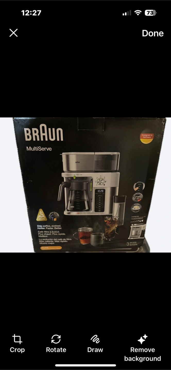 New Braun MultiServe coffee maker. Drip coffee machine, designed in Germany. Makes hot coffee quickly and setting for iced coffee. A few numbers are a little off on the clock but otherwise timer works great and the machine is descaled every 2 weeks. Pick up East end St Thomas