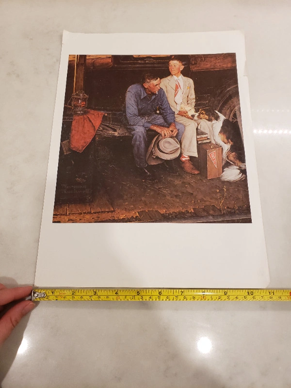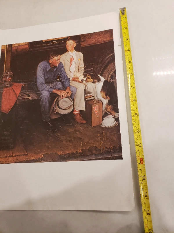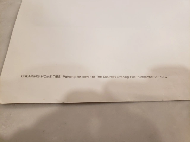 Reproductions of artworks in the collections and exhibitions of the Norman Rockwell Museum. Please note: there is wear to the paper. Please see the edges. Breaking Home Ties, The Saturday Evening Post cover, September 25, 1954. "I once did a cover showing a father seeing his son off to college. That year my three boys had gone away and I'd had an empty feeling it took me a while to adjust without them. This poignancy was what I wanted to get across in the picture...I put a funny kind of suit on the boy because he was a ranch boy leaving home for the first time I got most of my fan letters about the dog. You see the father couldn't show how he felt about the boy's leaving. The dog did." -Norman Rockwell Placing second after Saying Grace in a Saturday Evening Post readers popularity poll, Breaking Home Ties has always held the admiration of the general public. Art critics who have criticized Rockwell's painting for its sentimentality, however, have expressed appreciation of this work for its emotional realism and its technical mastery. In 2006, an amazing discovery was made when the painting believed to be the original was identified as a replica. The original painting was found behind a secret wall in the home of the painting's owner, the late cartoonist and artist Don Trachte of the comic strip Henry in Arlington, VT.