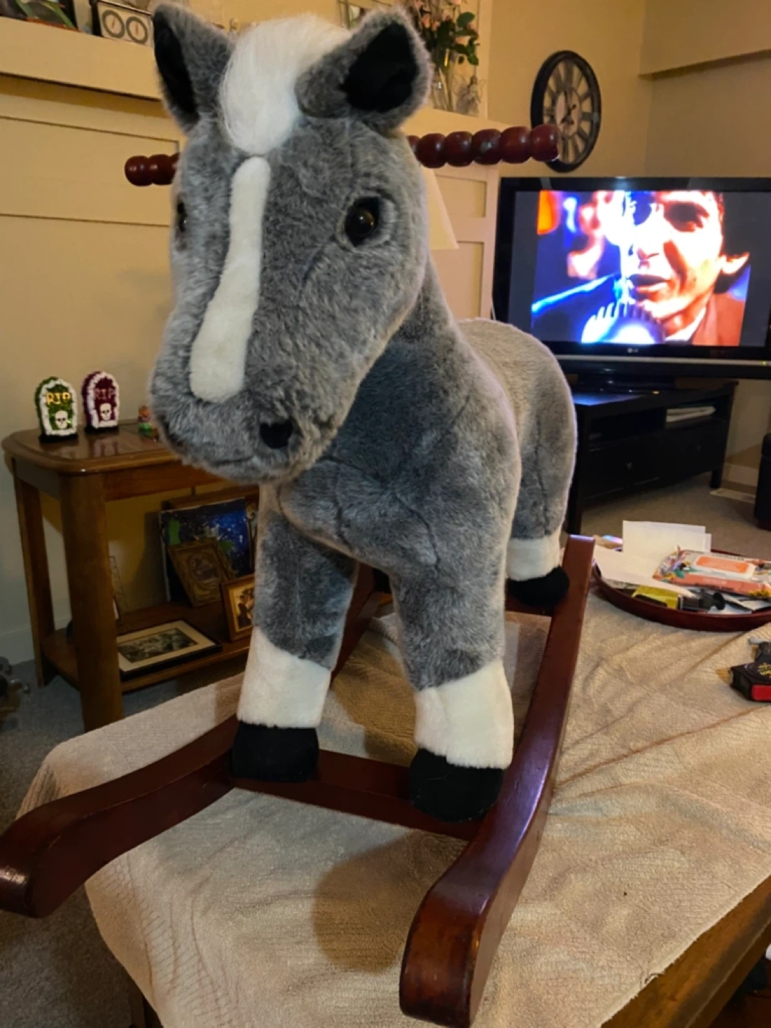Here's a charming Breyer plush rocking horse, perfect for adding a touch of whimsy to any room! It features a soft grey plush body with a white mane and tail. The rocking base is a sturdy wood. It's in great condition and ready for a new home!