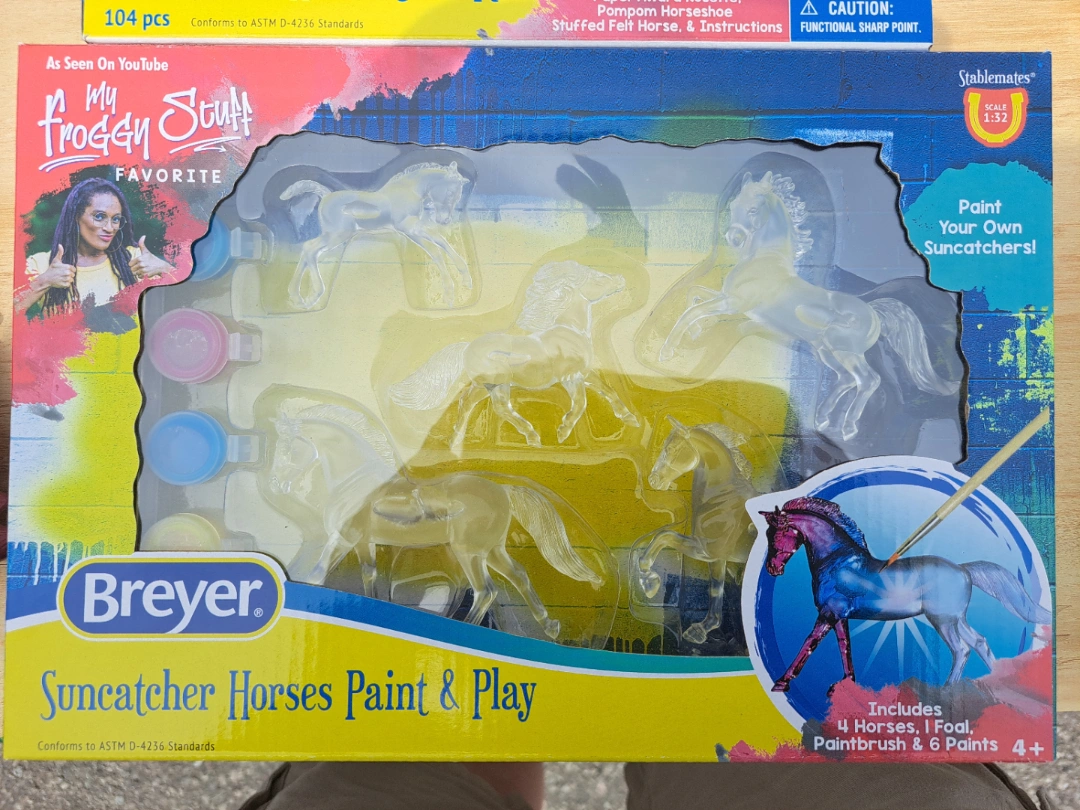 Get creative with this Breyer Suncatcher Horses Paint & Play set! It includes 4 horses, 1 foal, a paintbrush, and 6 paints. Perfect for ages 4+! Paint your own suncatchers and bring these Stablemates to life