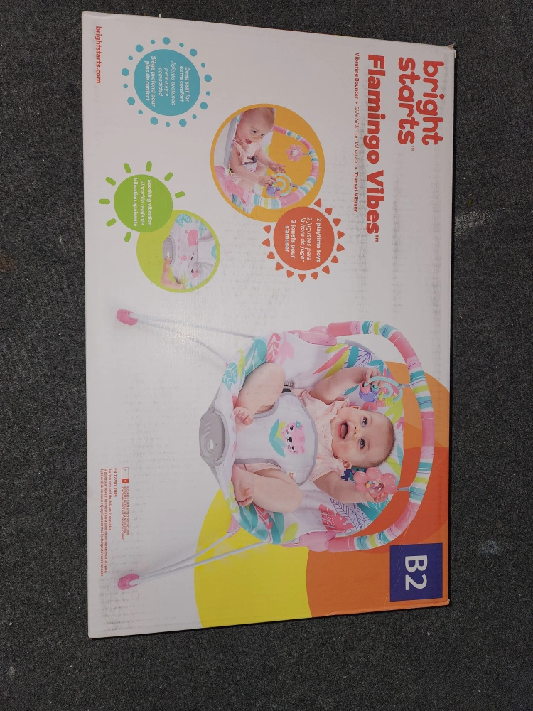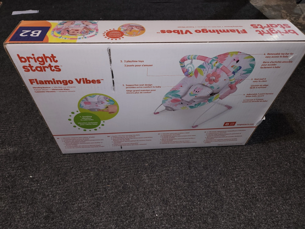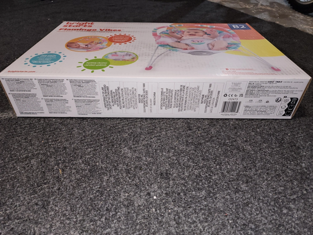 Selling a brand new Bright Starts Flamingo Vibes vibrating bouncer, still in the box! This bouncer features: - Soothing vibrations to calm baby - 2 playtime toys to amuse - Supportive seat design for extra comfort - Removable toy bar for easy access to baby - Adjustable 3-point harness for baby's security - Seat pad is machine washable