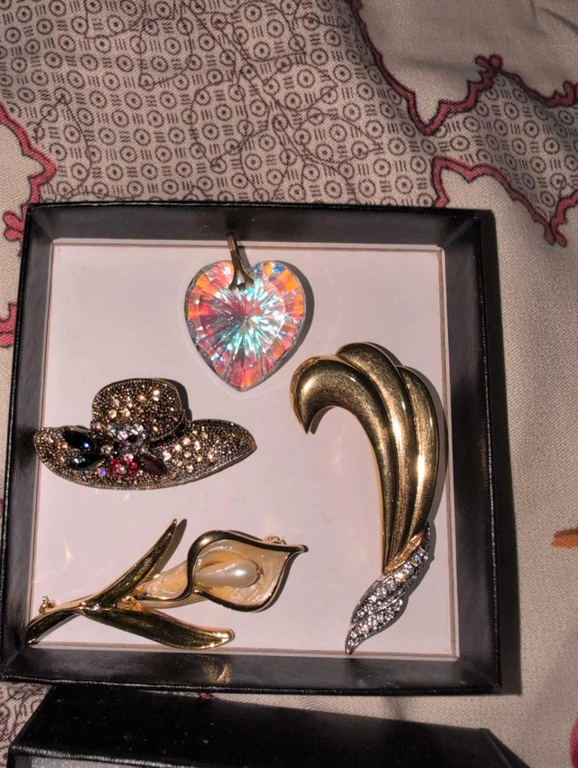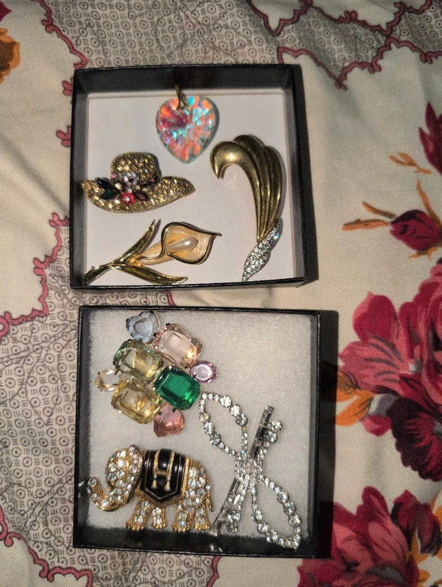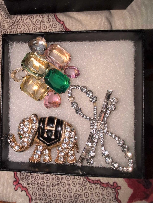 These brooches are a stunning collection of vintage-inspired pieces, perfect for adding a touch of elegance to any outfit. The lot includes brooches with intricate designs, such as a jeweled elephant, a golden flower, and a sparkling butterfly. The condition of these brooches varies, but they are all in good, wearable shape. I've priced these at $10 each. If the ad is still up, the item is available!