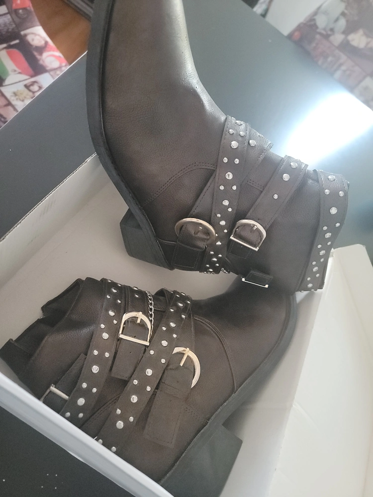 Cute brown ankle boots with studded straps and buckle details! They're in great condition and come with their original box