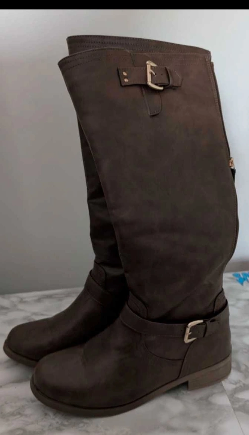 Selling a pair of brown boots in size 7. They are in great condition and have a stylish buckle detail. Perfect for fall and winter!