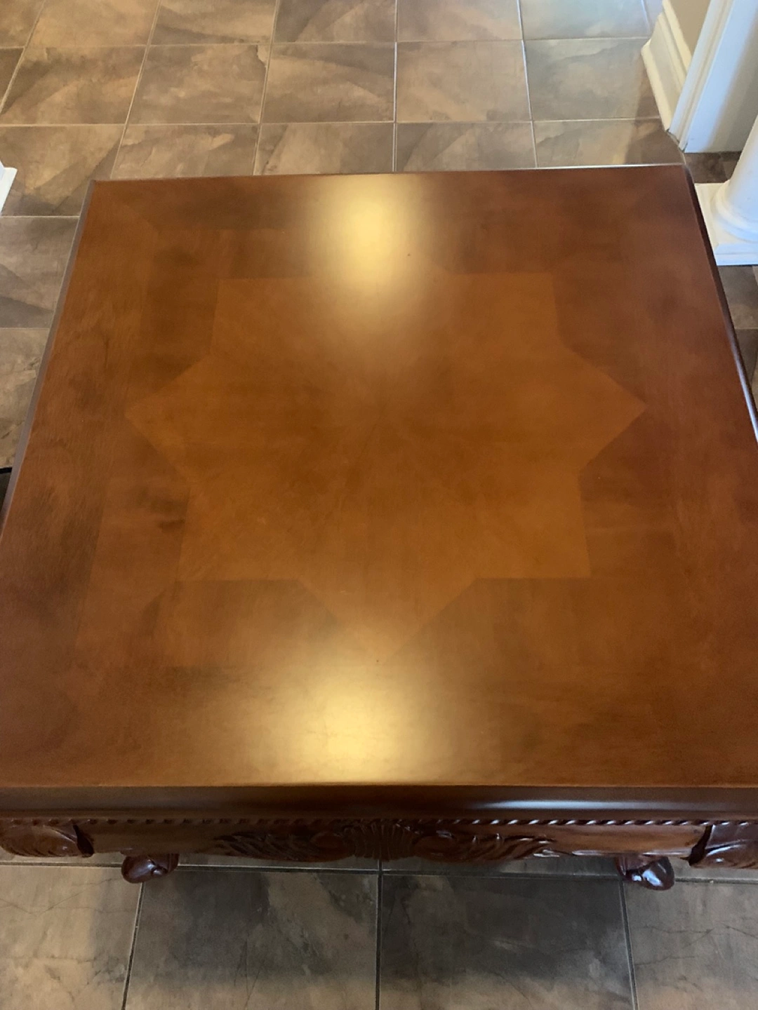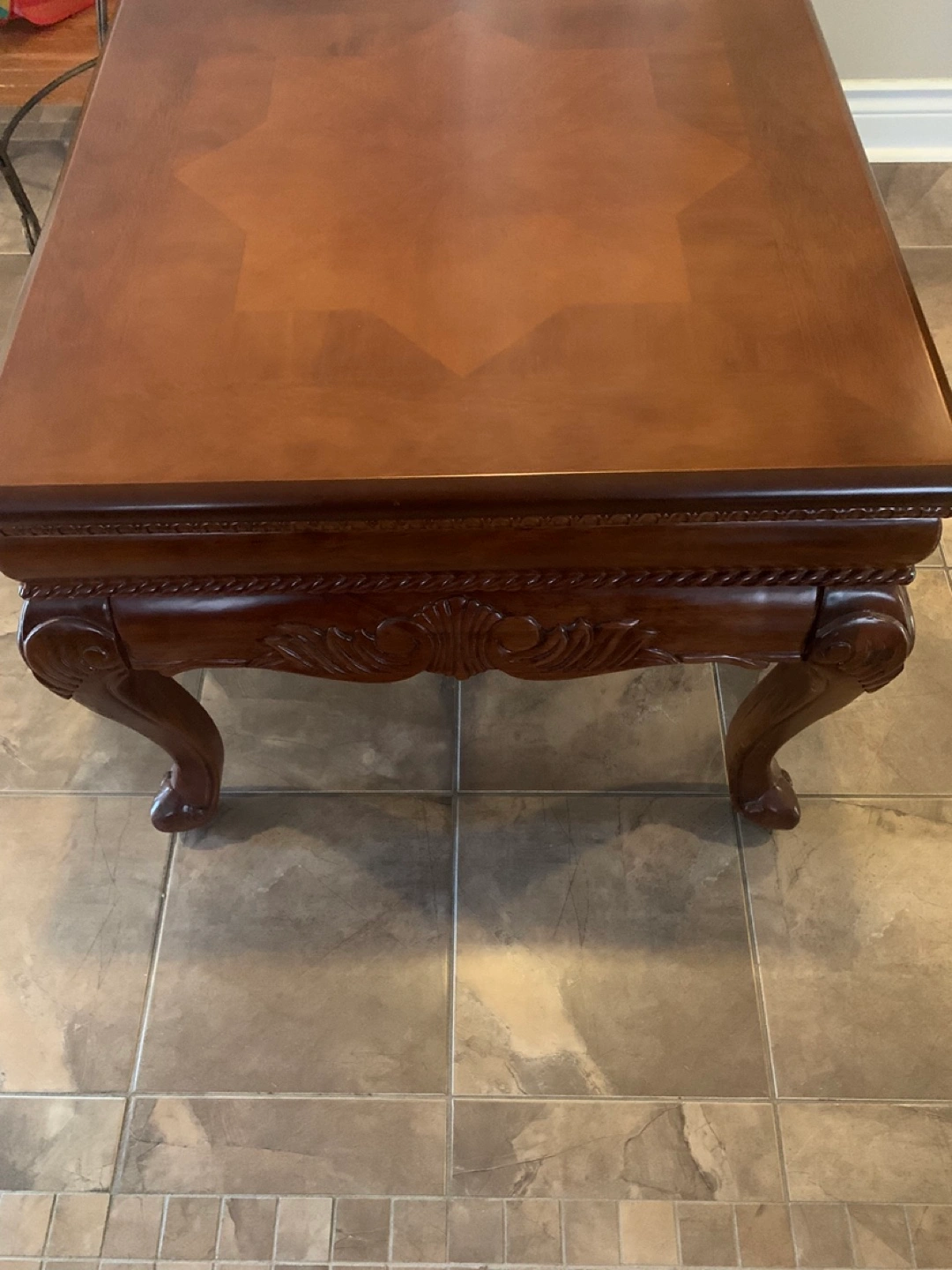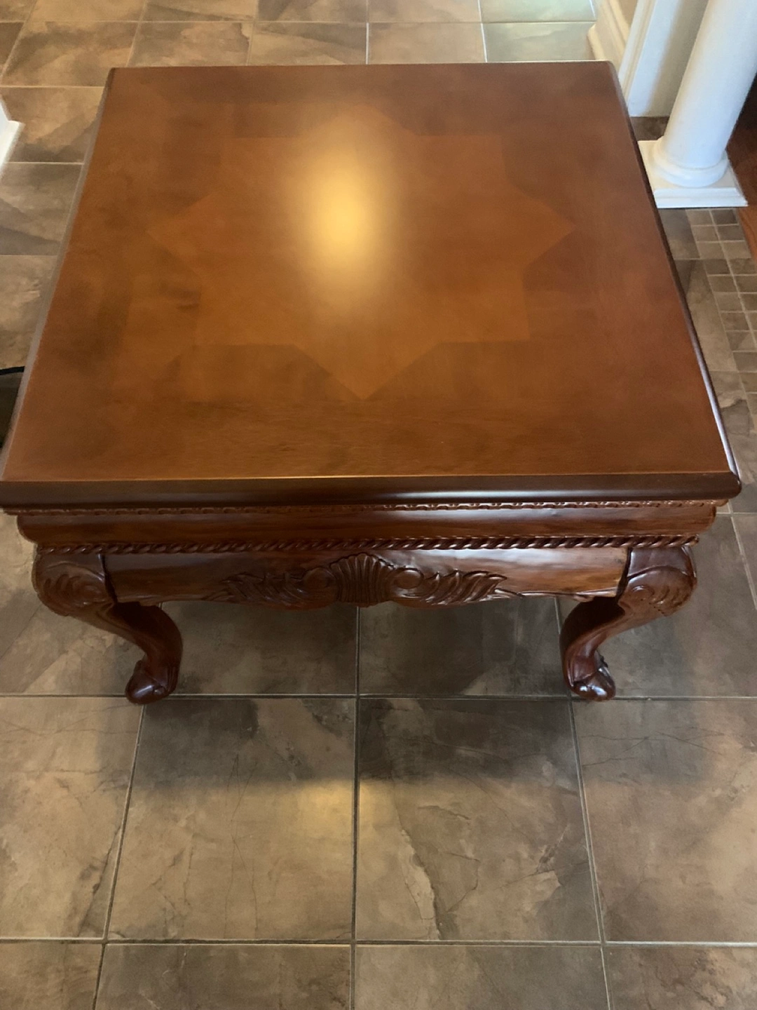 Selling a lovely brown wooden end table. It has a beautiful star pattern on top and ornate detailing on the legs and sides. It's in great shape and would be a wonderful addition to any living room . Solid wood heavy construction.