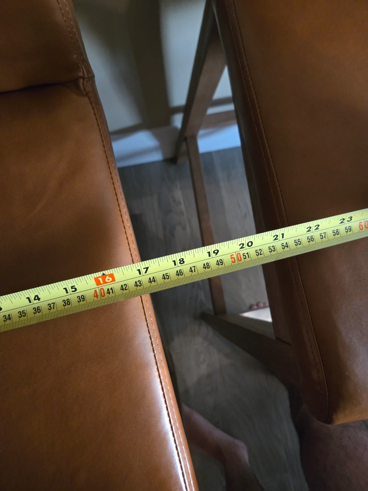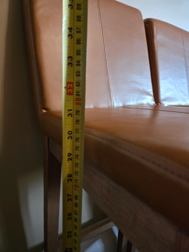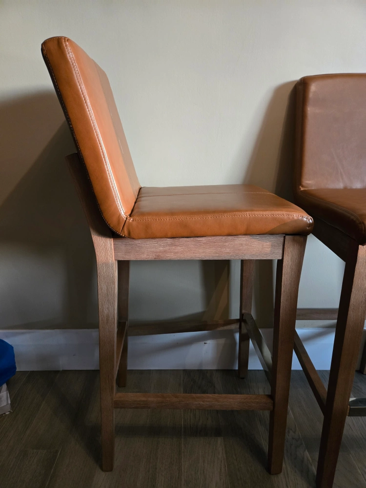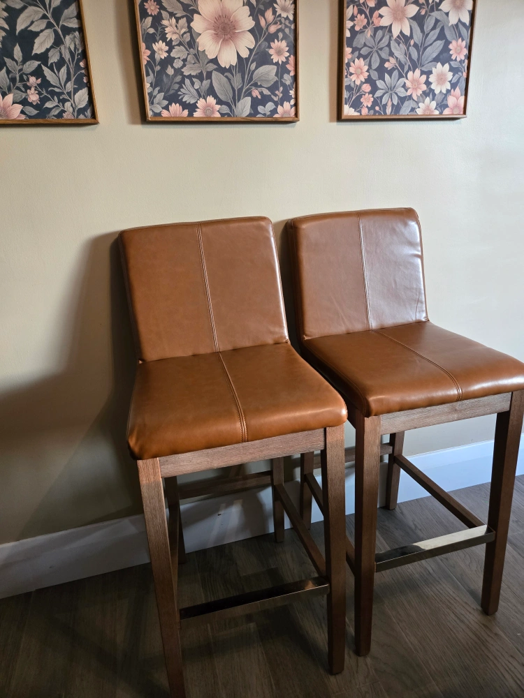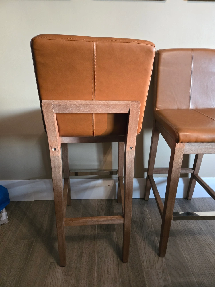 Selling a set of 2 brown faux leather bar stools. They are in great condition and would look great in any kitchen or bar area. depth: 18in width 17 in Height from floor to top of backrest: 43in Height from floor to top of seat: 30 in