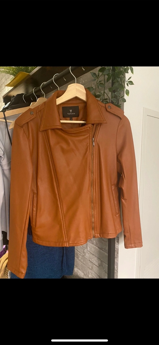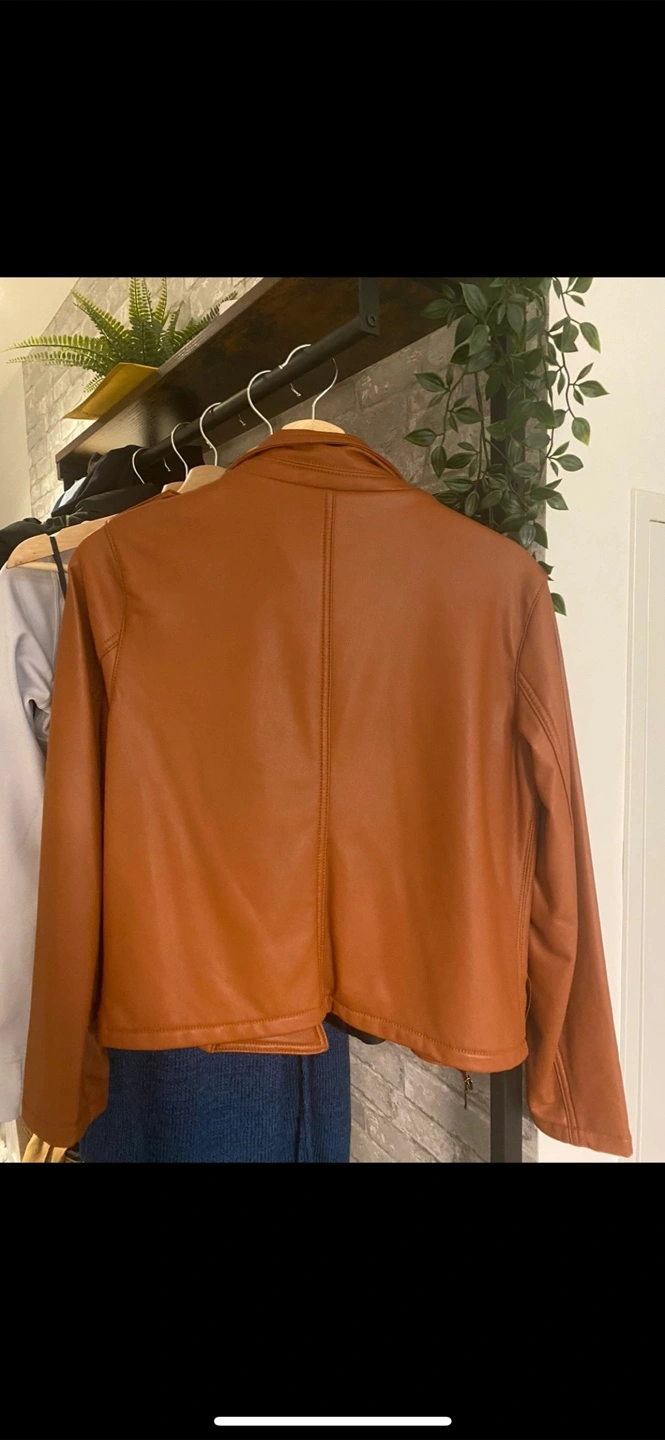 Brown jacket, with a zipper. Features a collared neck. Perfect for an afternoon stroll.